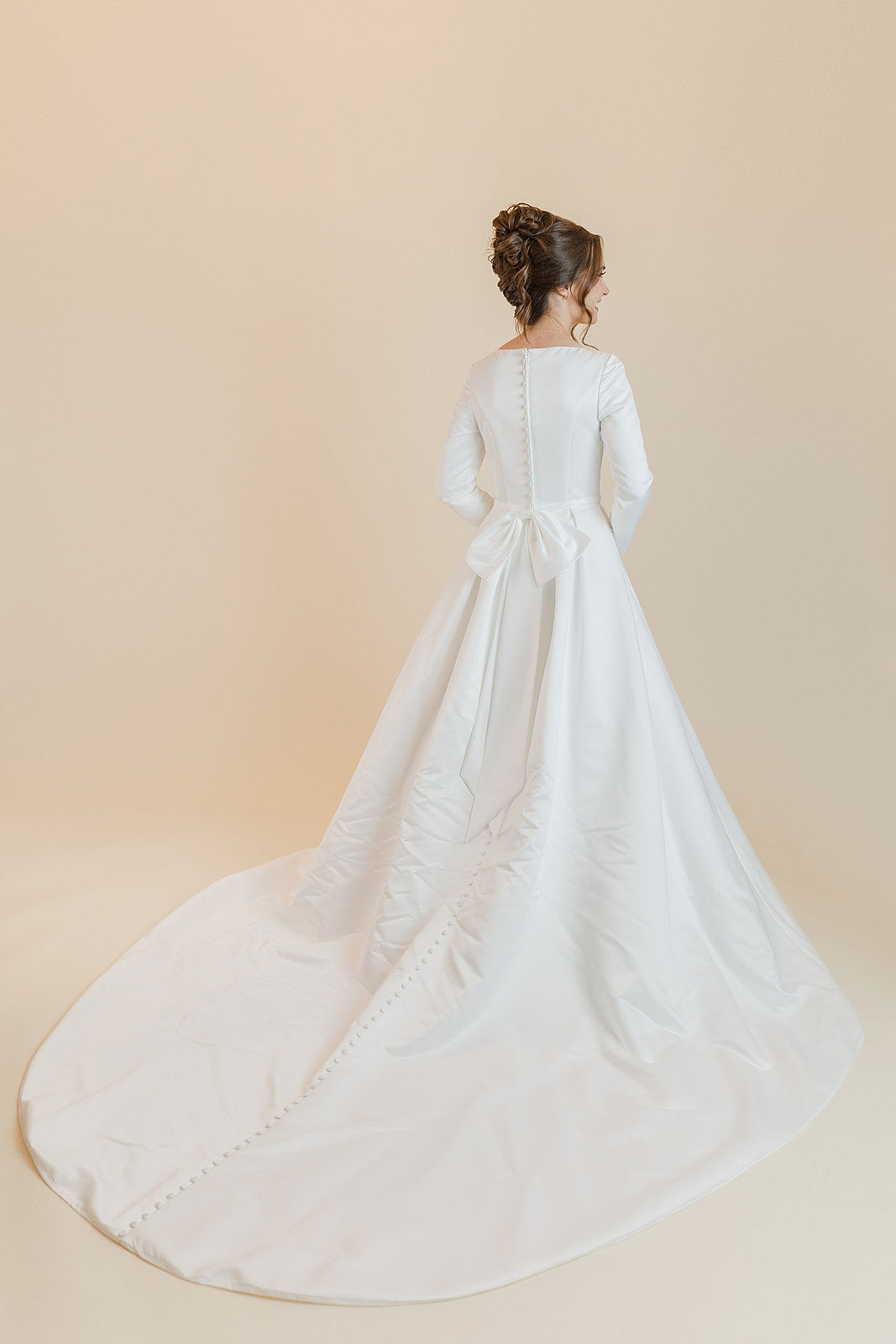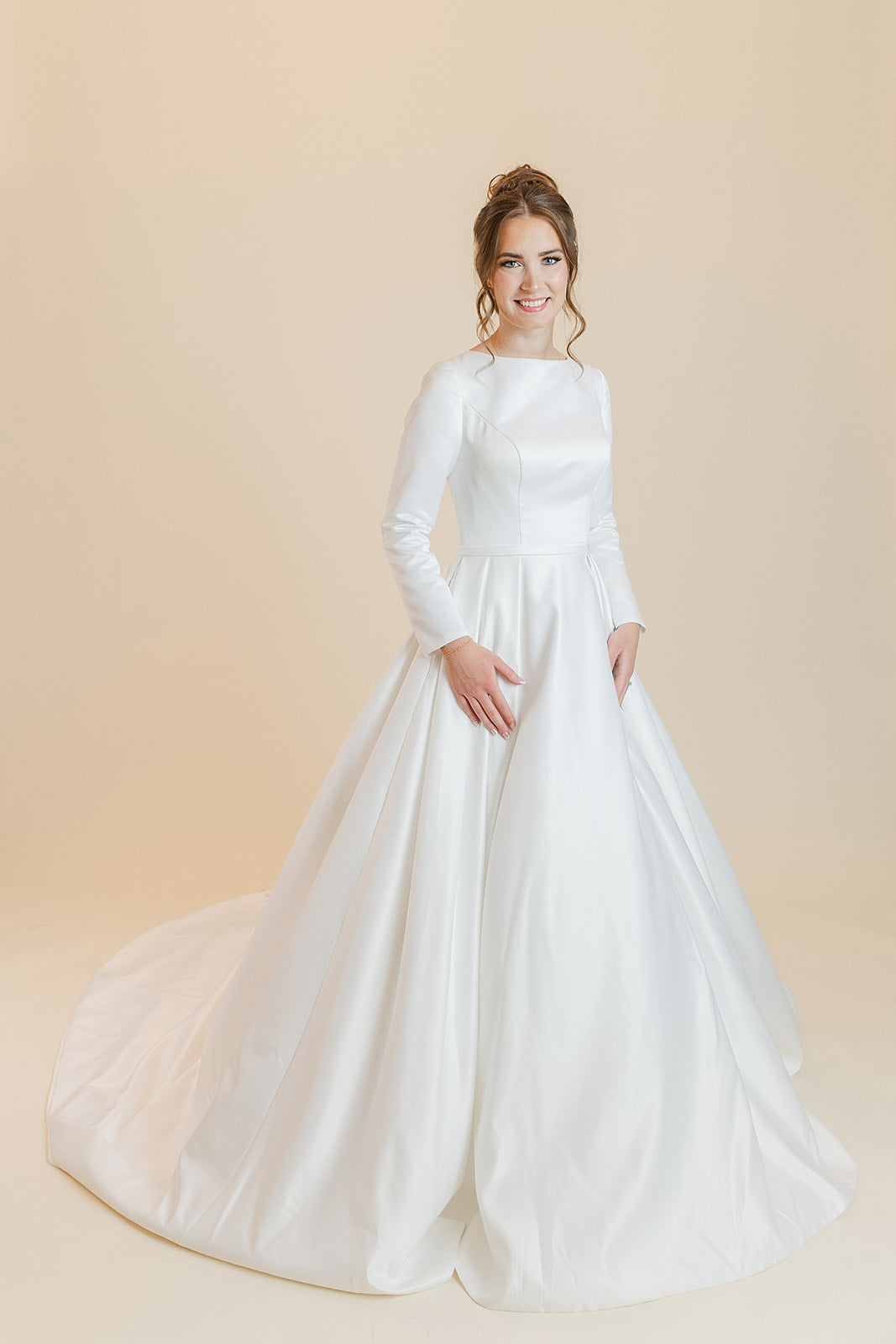 Jadyn is a full ball gown silhouette made of a lovely satin and has pockets on the full skirt. We love the long sleeves on our Jadyn dress with button closures at the wrist. Our Jadyn modest jewel neckline wedding dress has a zipper back closure with a bow on the back waistline and buttons down the entire back of this stunning wedding dress.  Who wouldn't fall in love with this dress!