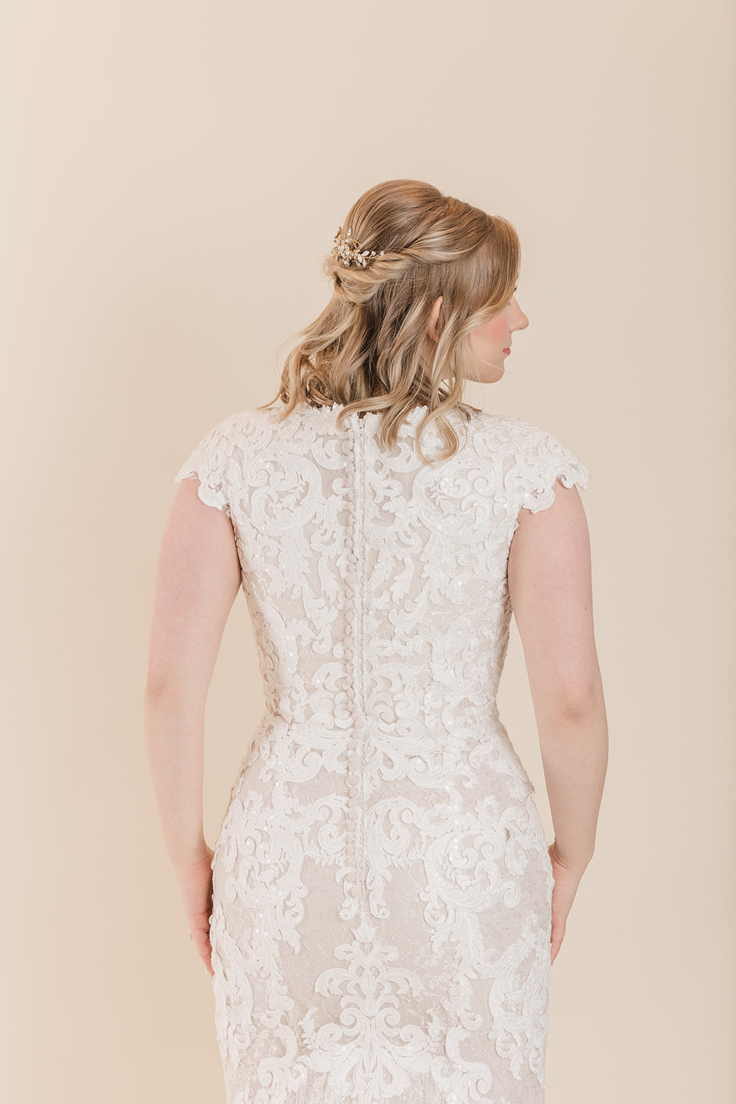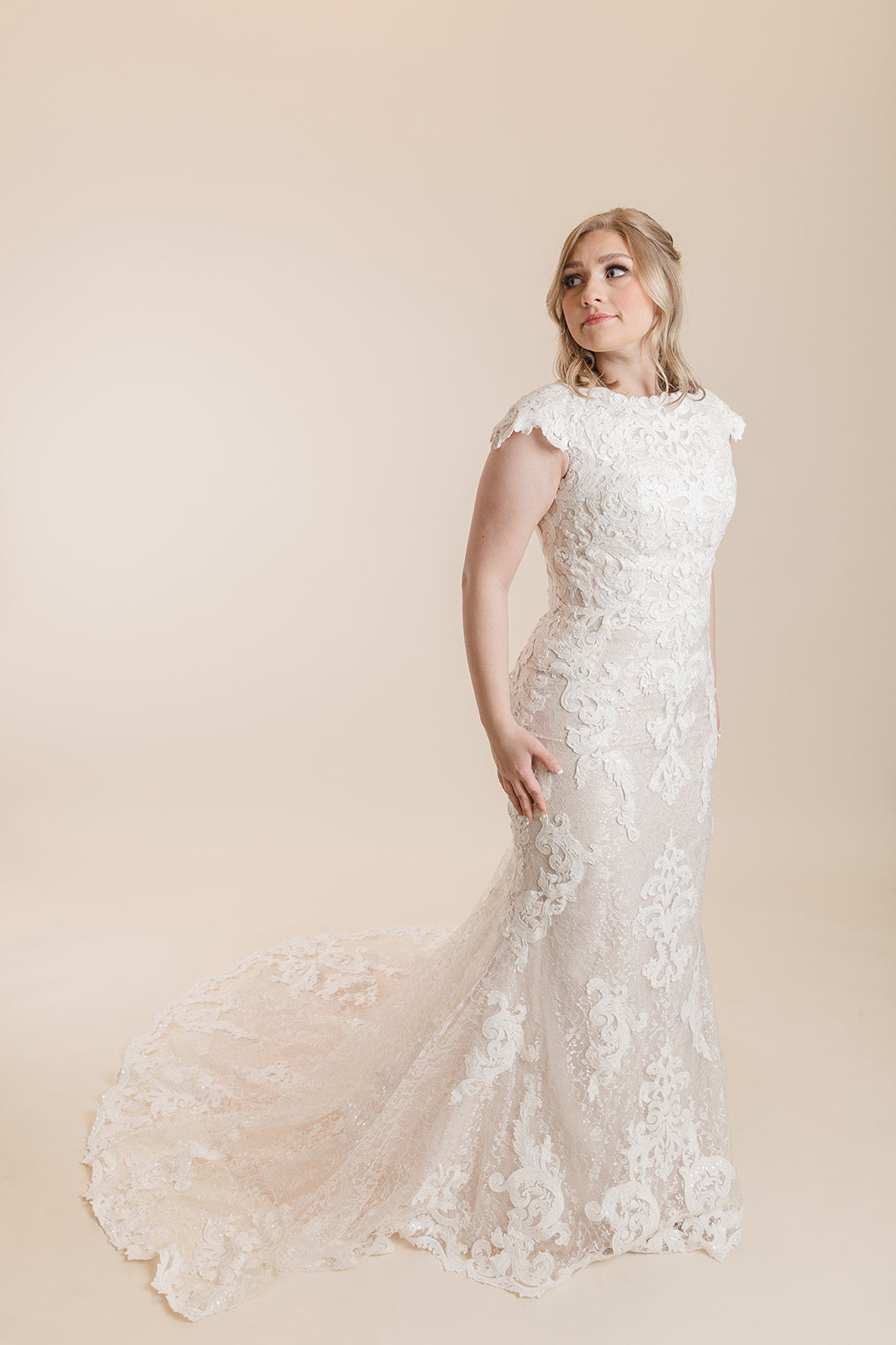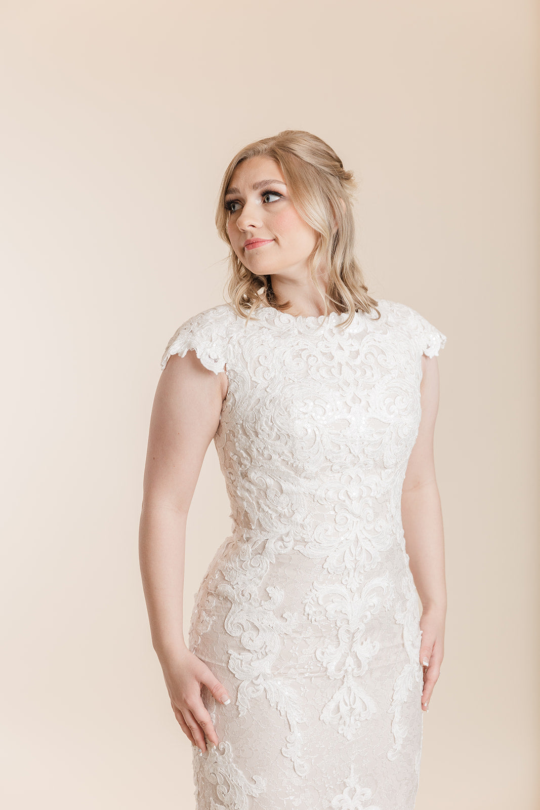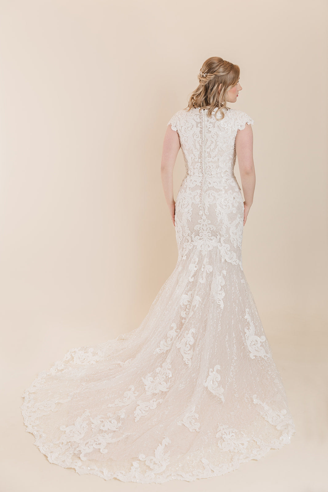 This beautiful fit and flare gown features beautiful allover lace atop tulle, a jewel neckline, and lace cap-sleeves. Finished with covered buttons over zipper and inner elastic closure. Only available in Size 10 in Ivory/Blush.
