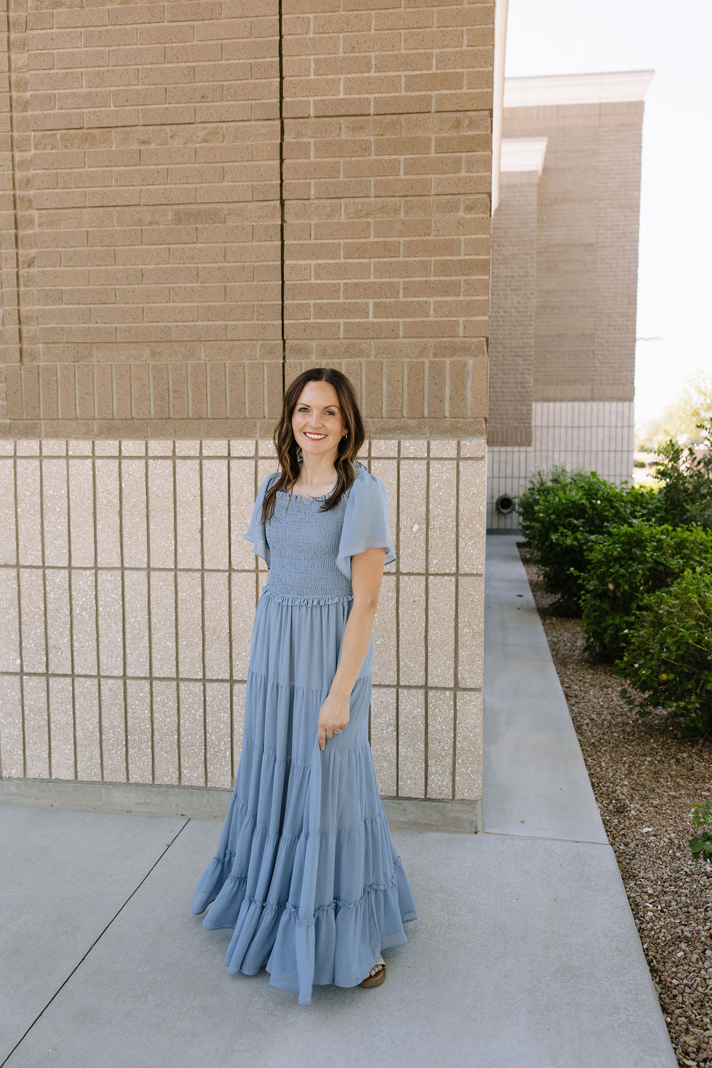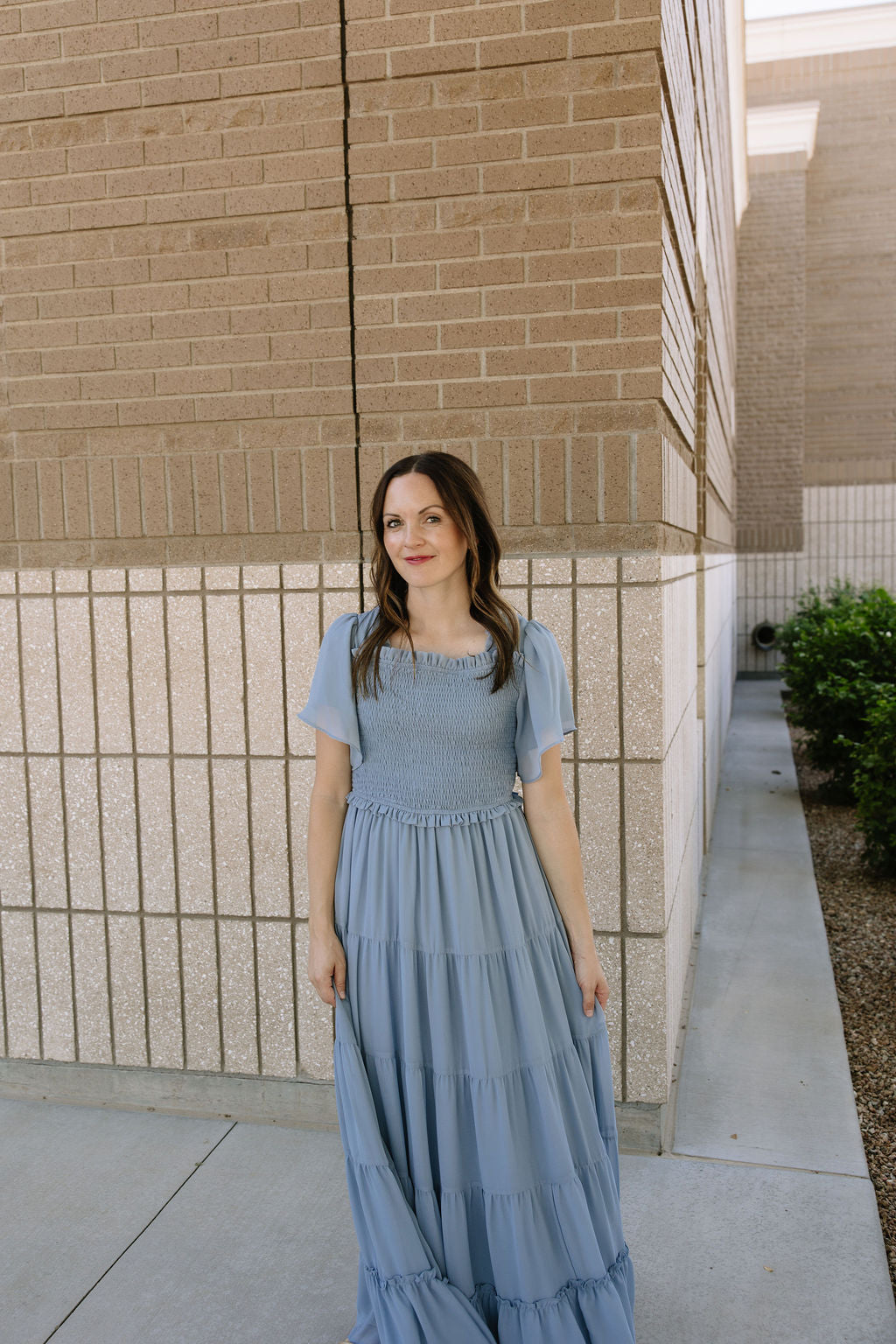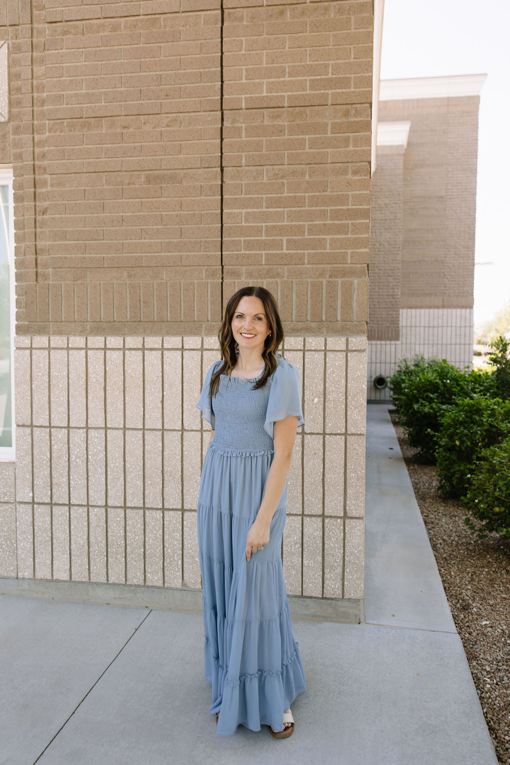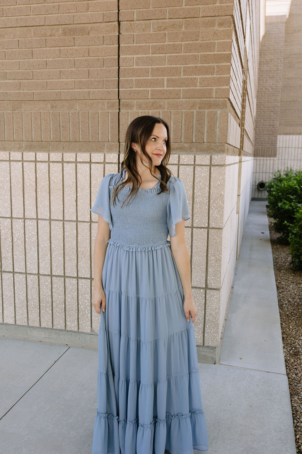 Maxi dress with a tiered skirt, smocked bodice, square neckline with ruffle detail, and flutter sleeves. A timeless and elegant choice for so many occasions! Stretchy bodice makes it bump-friendly and nursing-friendly.