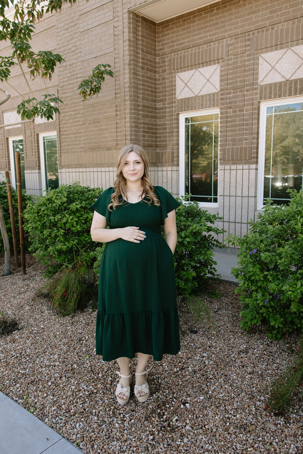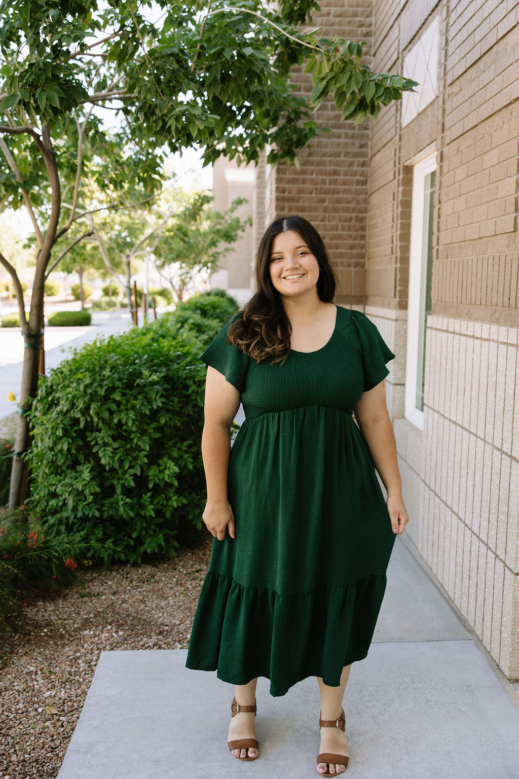 Midi length dress with ruffle hem, smocked bodice, v neckline, and flutter sleeves.
