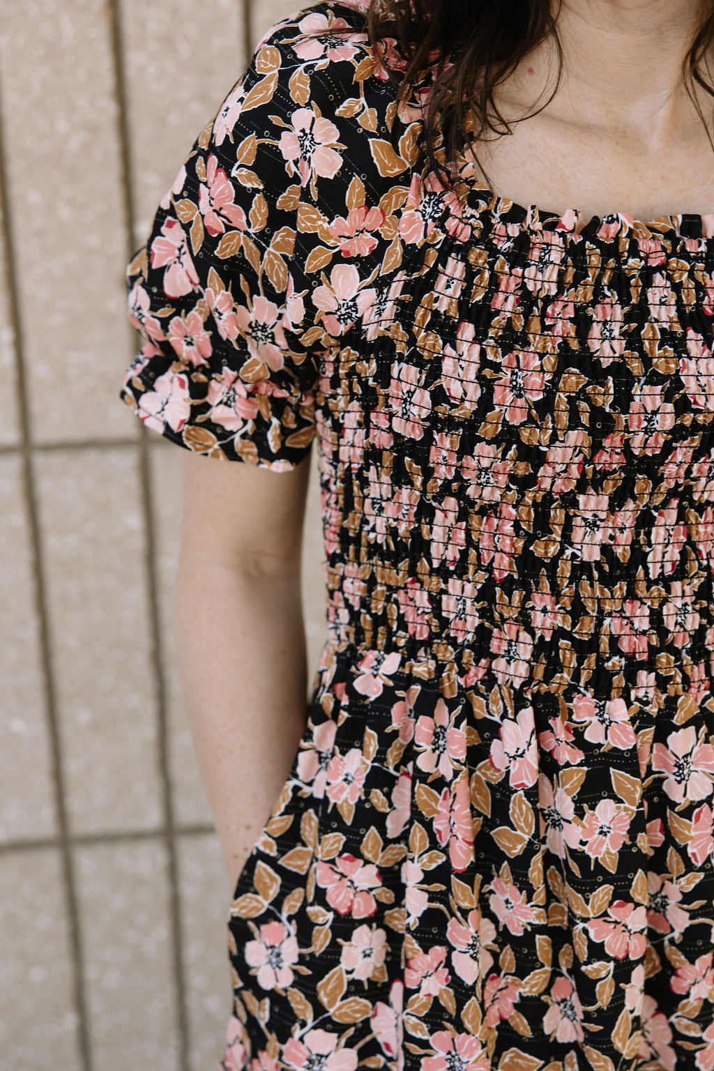 Midi length dress, smocked bodice with empire waist, sweetheart neckline and puff sleeve with ruffle detail on hem.