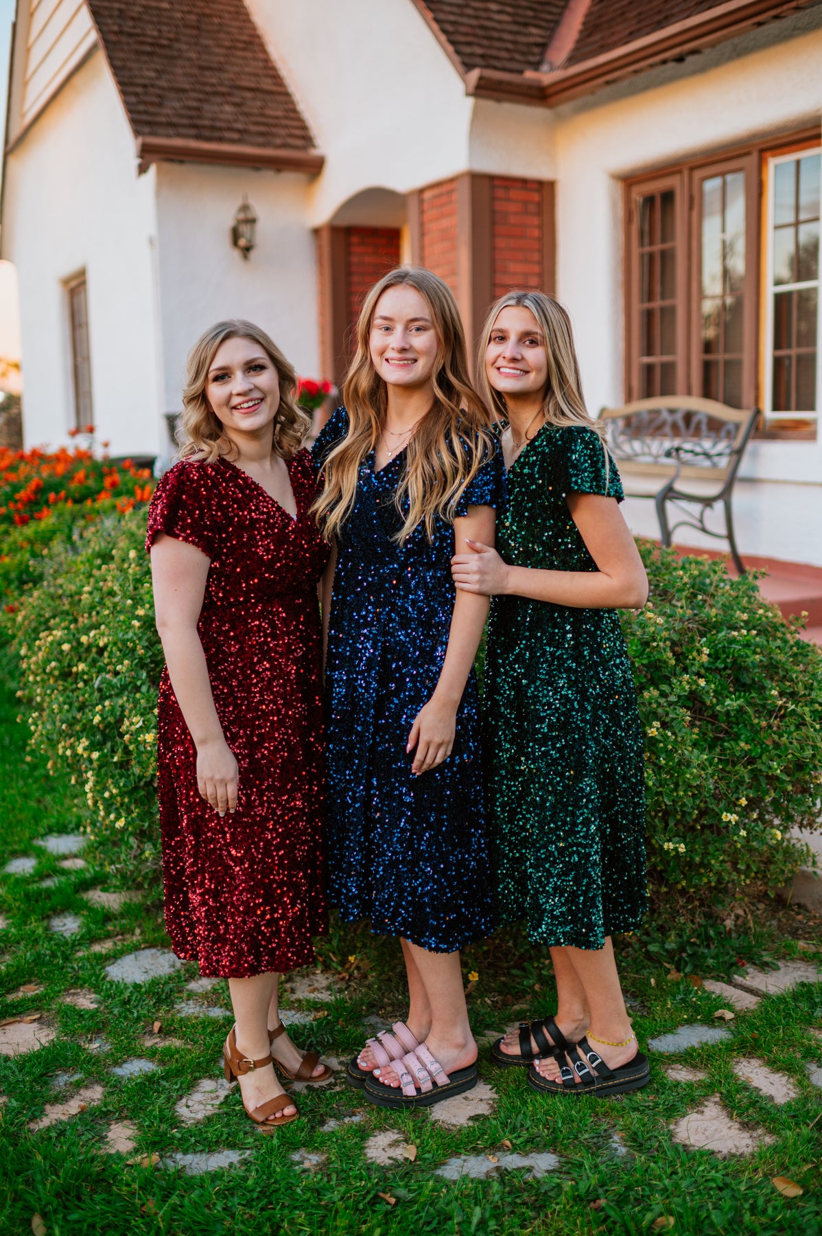 All sequin knee length dress with V-neckline and a line skirt. Fun dress for any occasion and nursing and baby bump friendly!