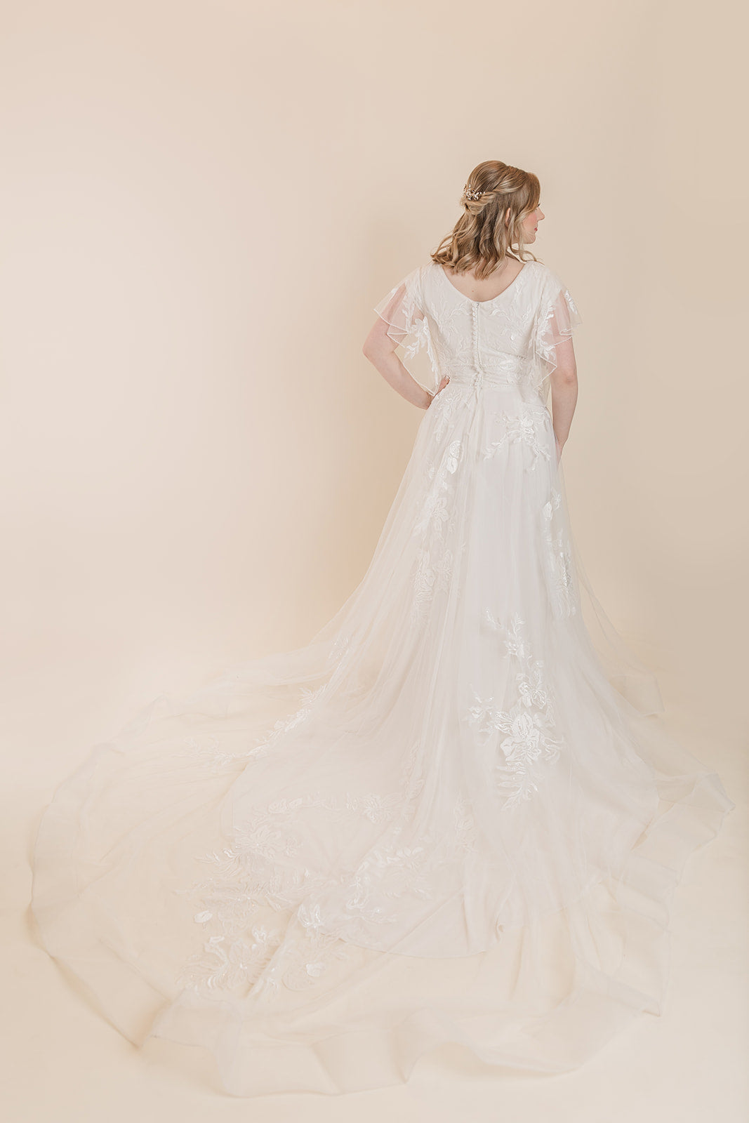 A-line tulle gown features beaded lace on bodice embellished with Swarovski crystals accented in beaded trim. It has a scoop neckline, modest V-back, tulle flutter sleeves edged with beading, covered buttons over zipper closure, and horsehair hem finish. Only available in size 12 Ivory/Soft Nude