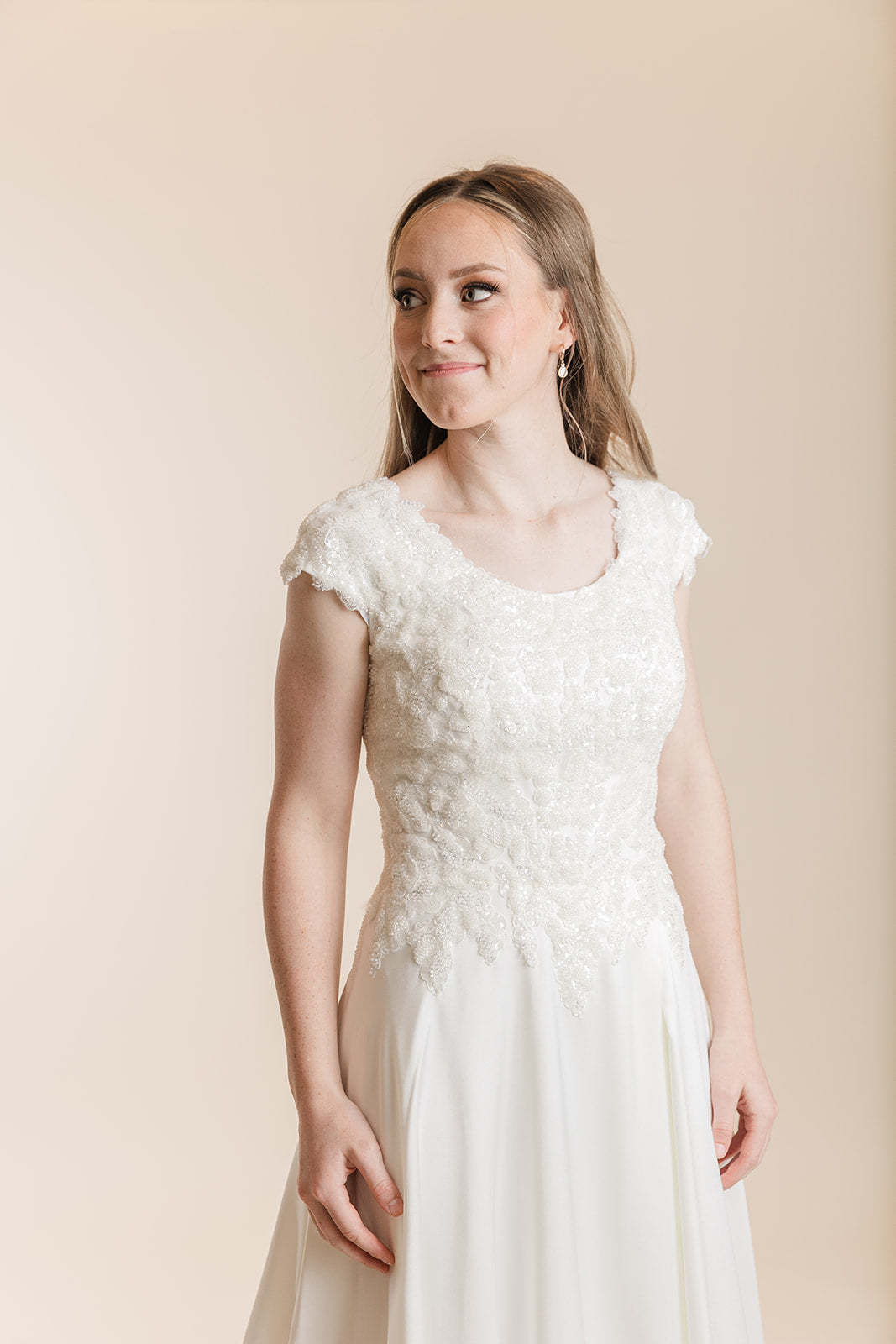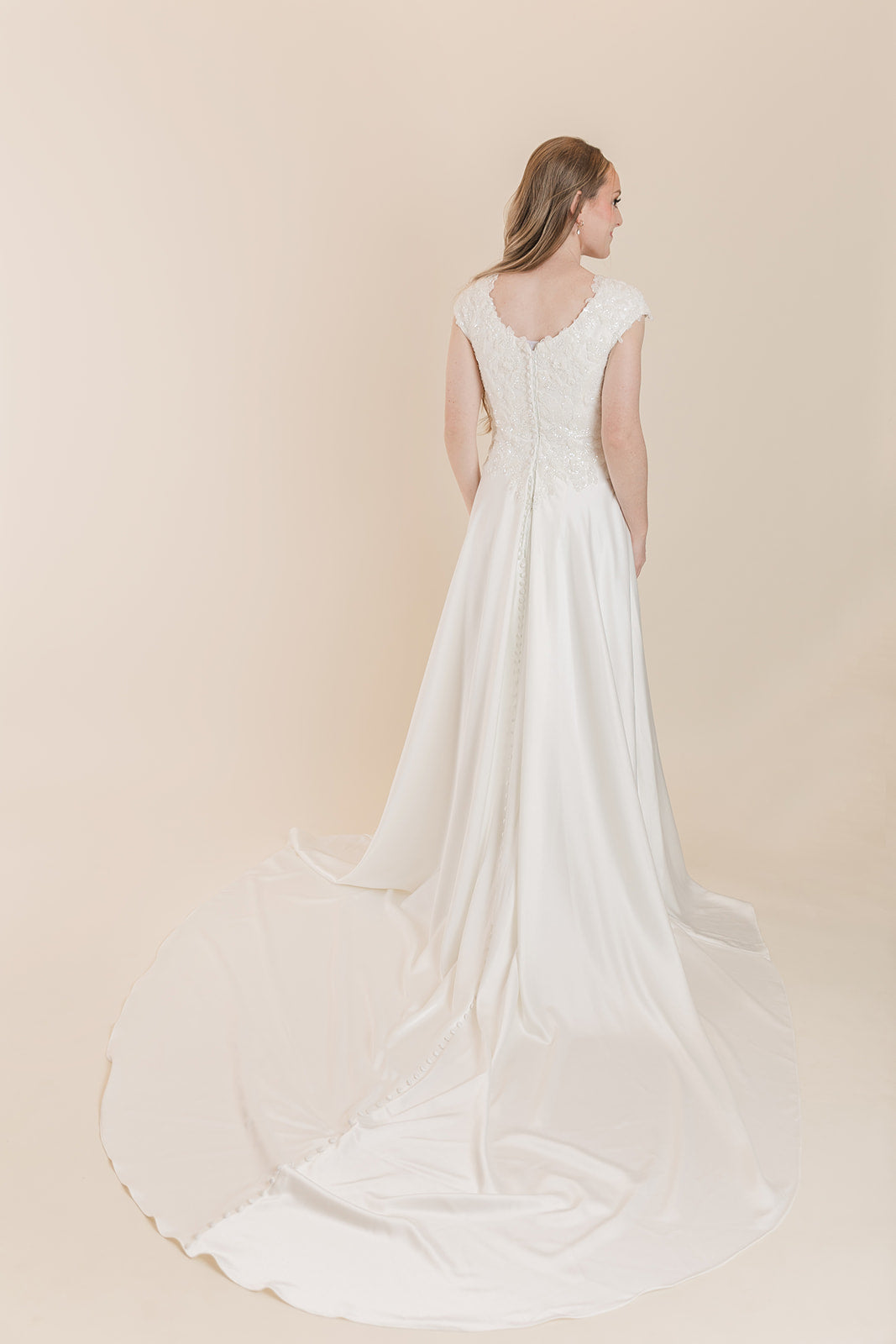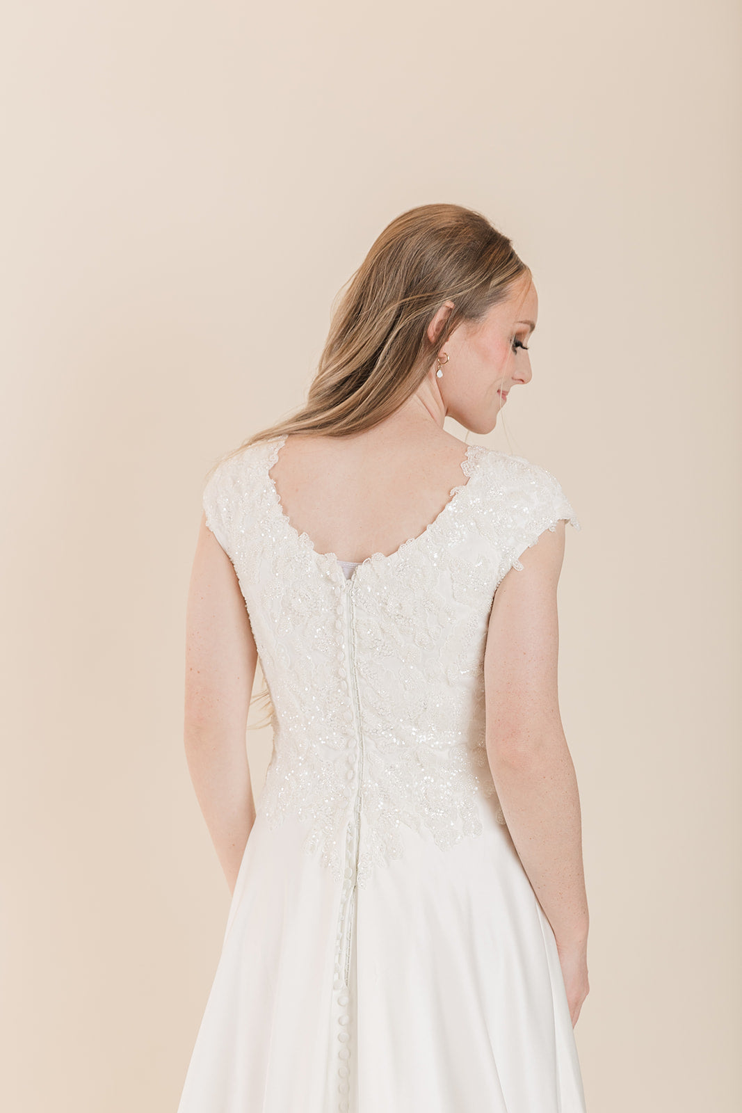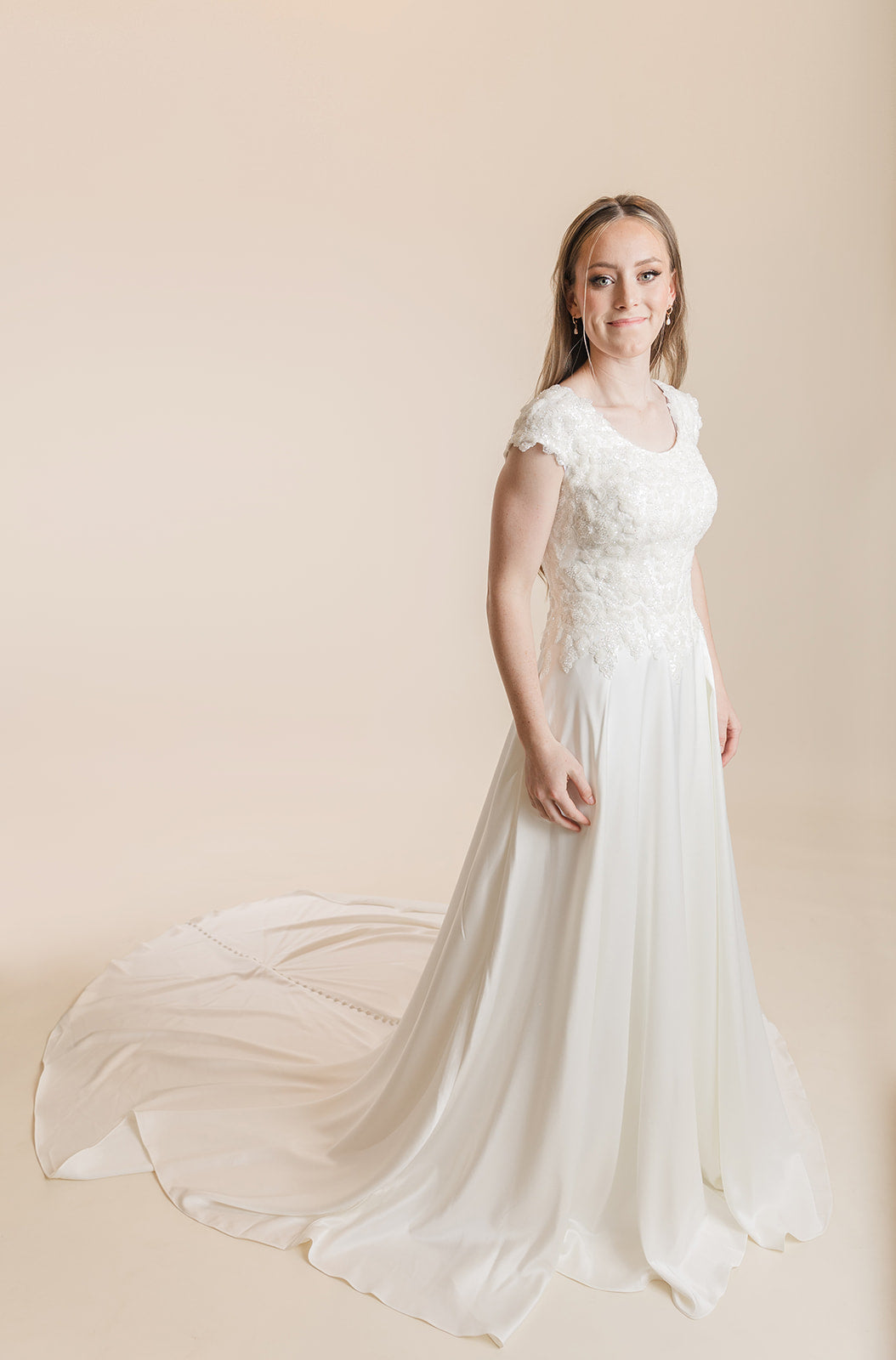 The Tilda Leigh is timeless A Line flowy chiffon gown with a scoop neckline on the front and back bodice. The bodice is covered with beautiful beaded lace and accented with small cap sleeves. The skirt features a knee high slit and side pockets which ever bride love! The Tilda Leigh has buttons trailing to the very end of the amazing train on this dress. Only available in size 6 in Ivory.