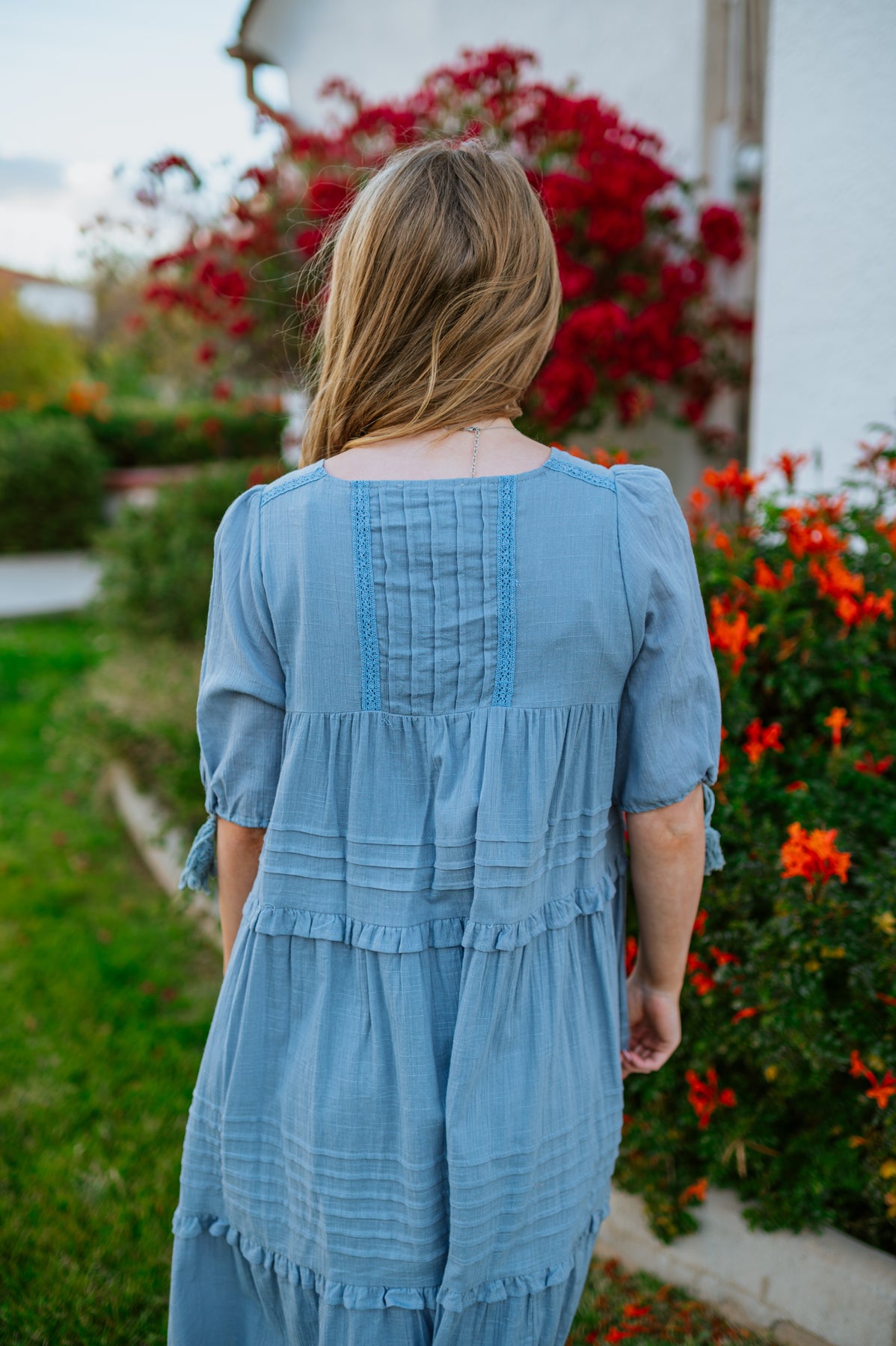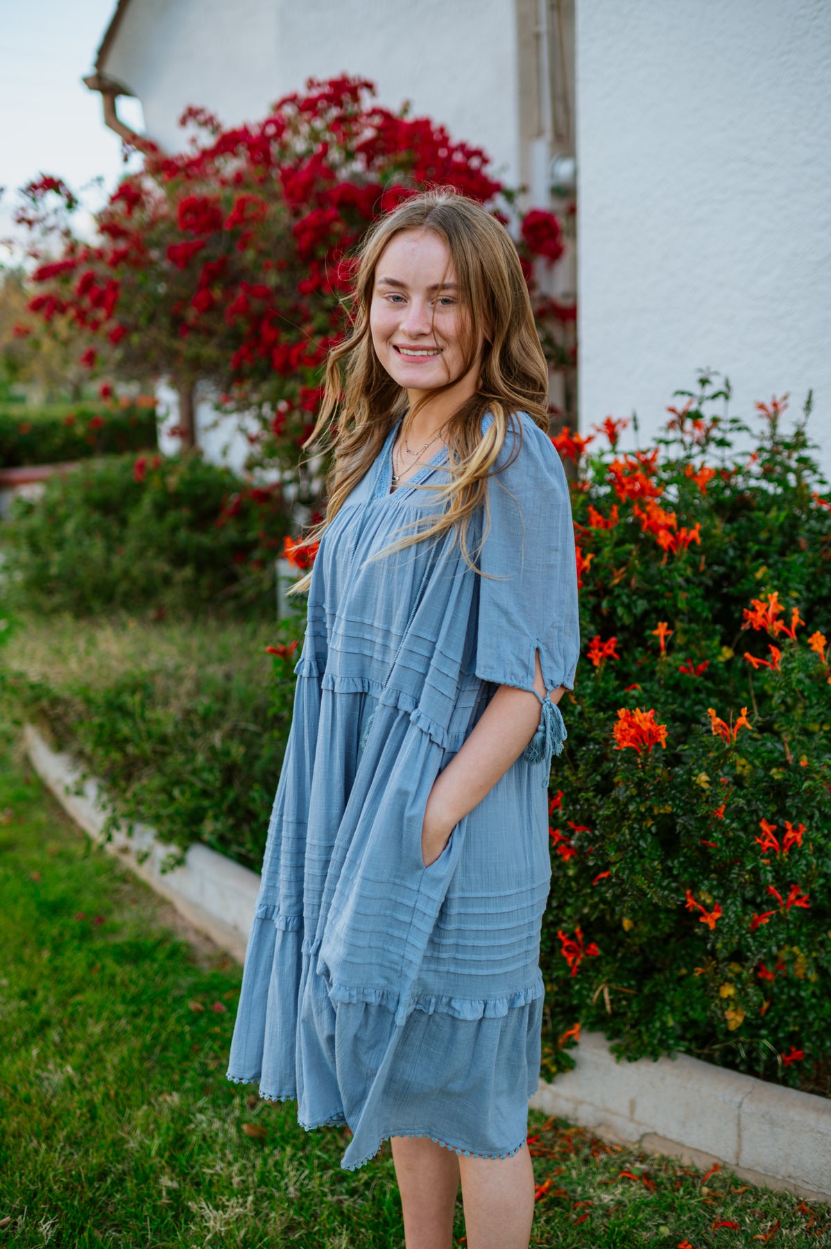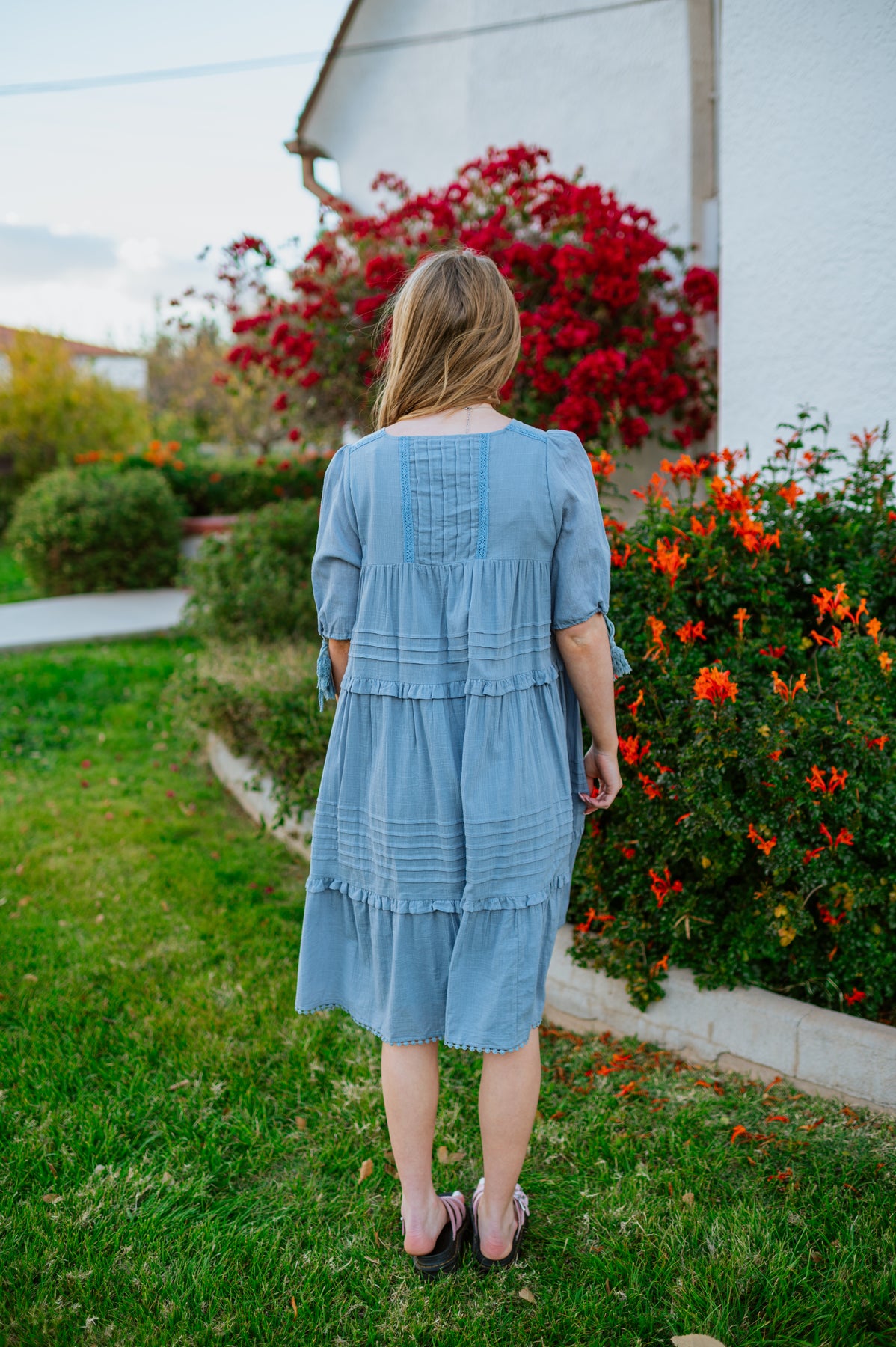 Tiered mini dress with tiered skirt and tucks on the bodice and the skirt, puffy sleeves with tie and also at the v neckline with pockets on the skirt. Nursing and baby bump friendly!