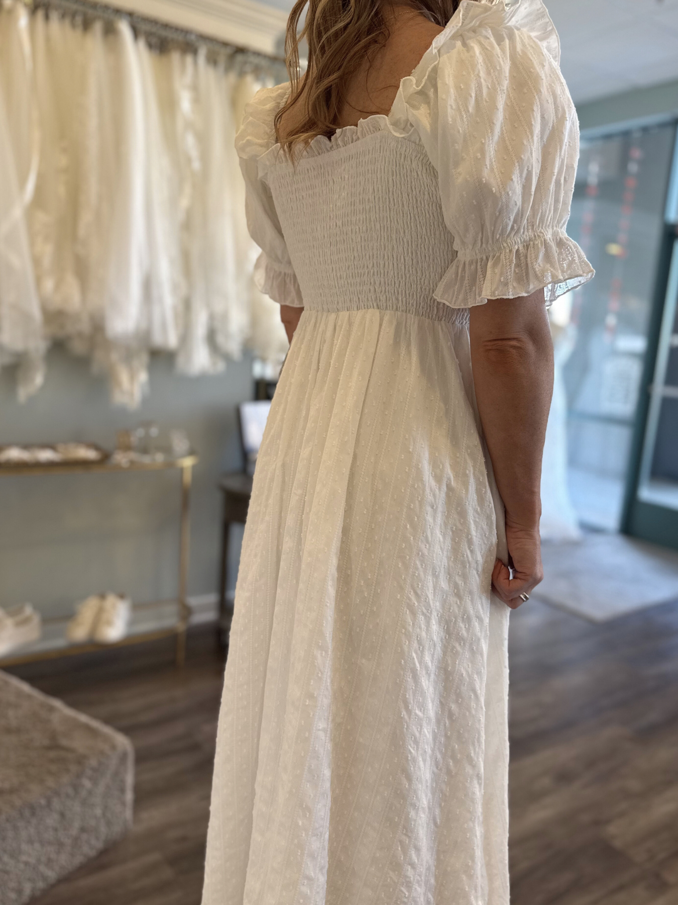 Flowy maxi dress made of a textured fabric features a V-neckline, flutter sleeves, smocked elastic waist and tiered skirt. This is a great dress for so many occasions and is baby bump friendly!