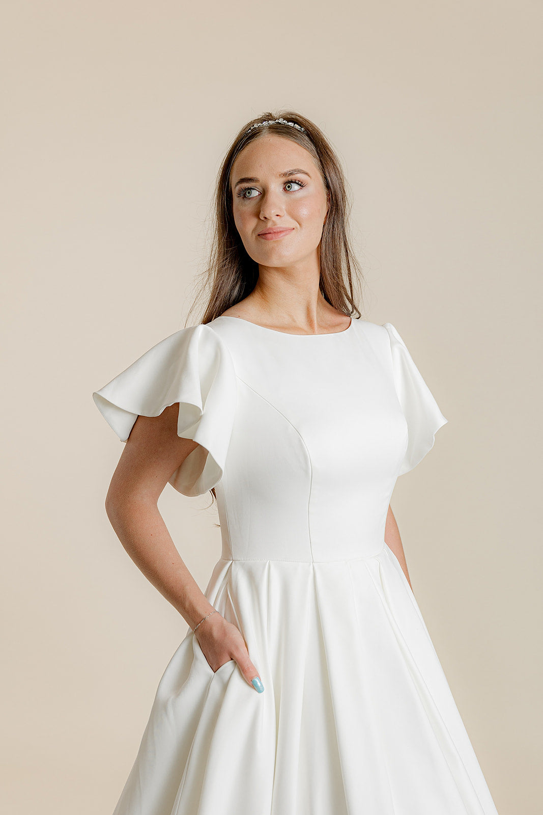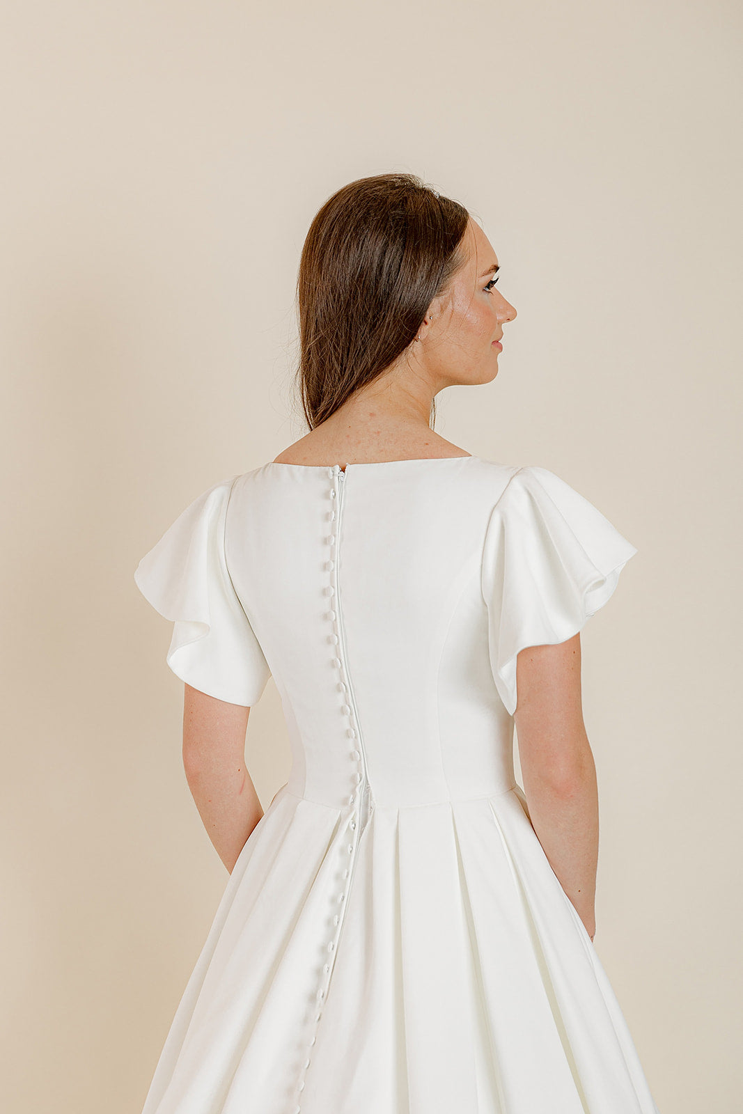 Clementine is our beautiful ballgown in very soft french satin with a square neckline, flutter sleeves, and a full pleated skirt with pockets. The fabric on this dress is amazing and has the softest feel to it. The back of the dress is adorned with buttons down the entire length of the beautiful train on this dress! A stunning dress on any bride for their special day!
