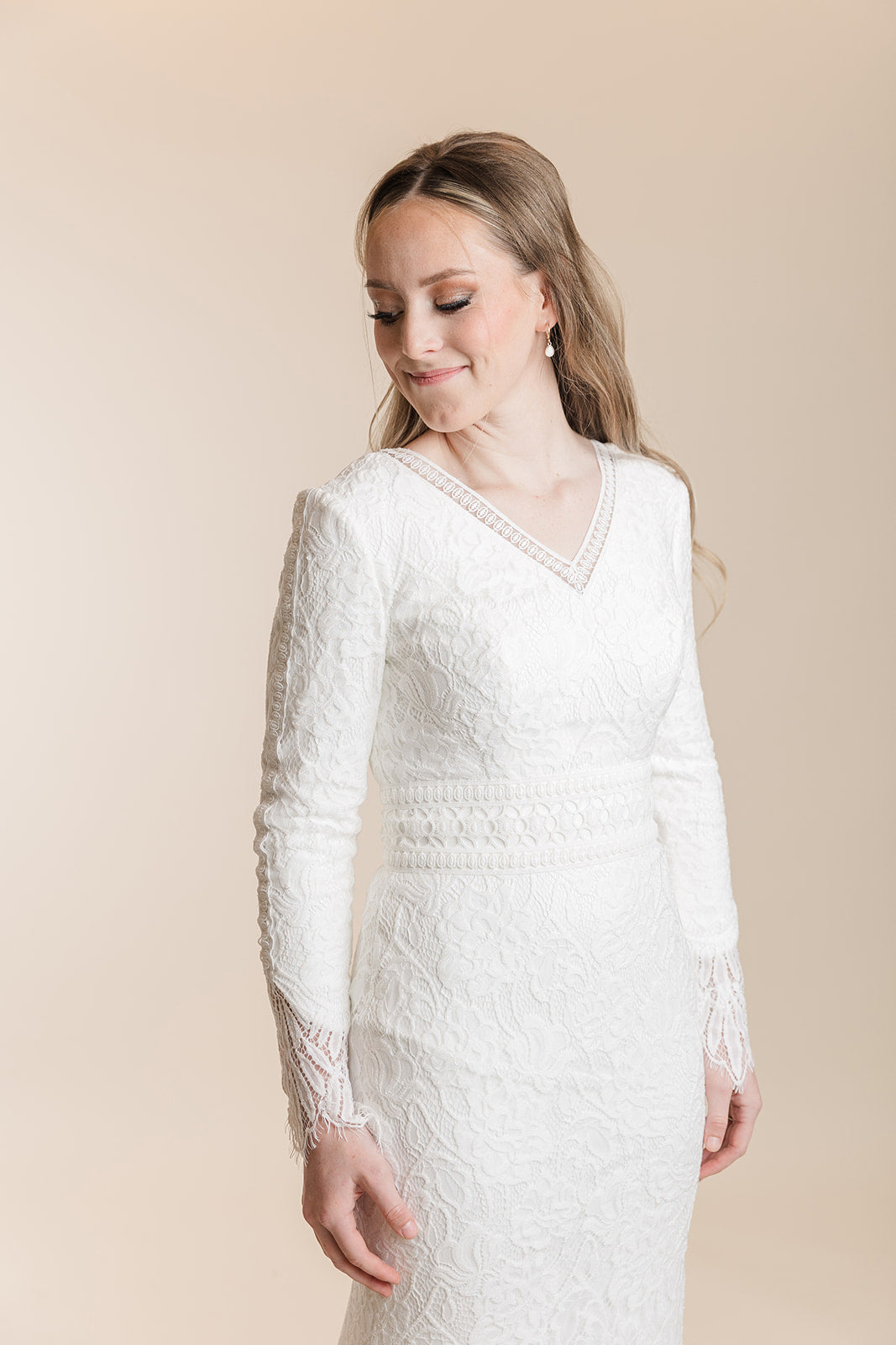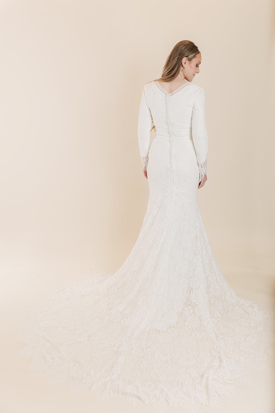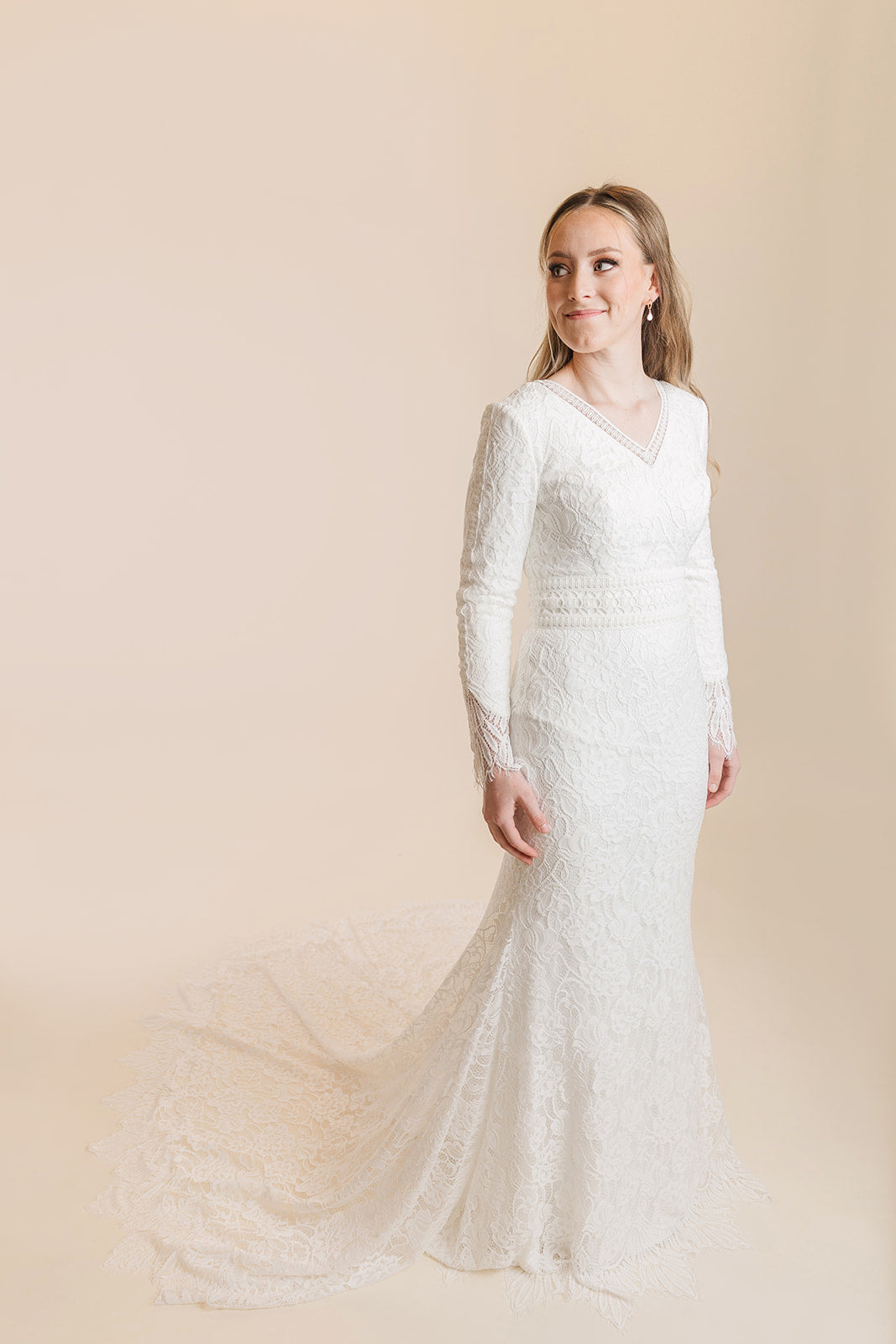 Fitted gown with a V-neckline features beautiful all over lace detail with scalloped edge on long sleeves and train. Contrasting lace trim sits just above the natural waist and ties in the trim along the neckline and sleeves. The back is finished with covered buttons. Only available in size 4 in Ivory.
