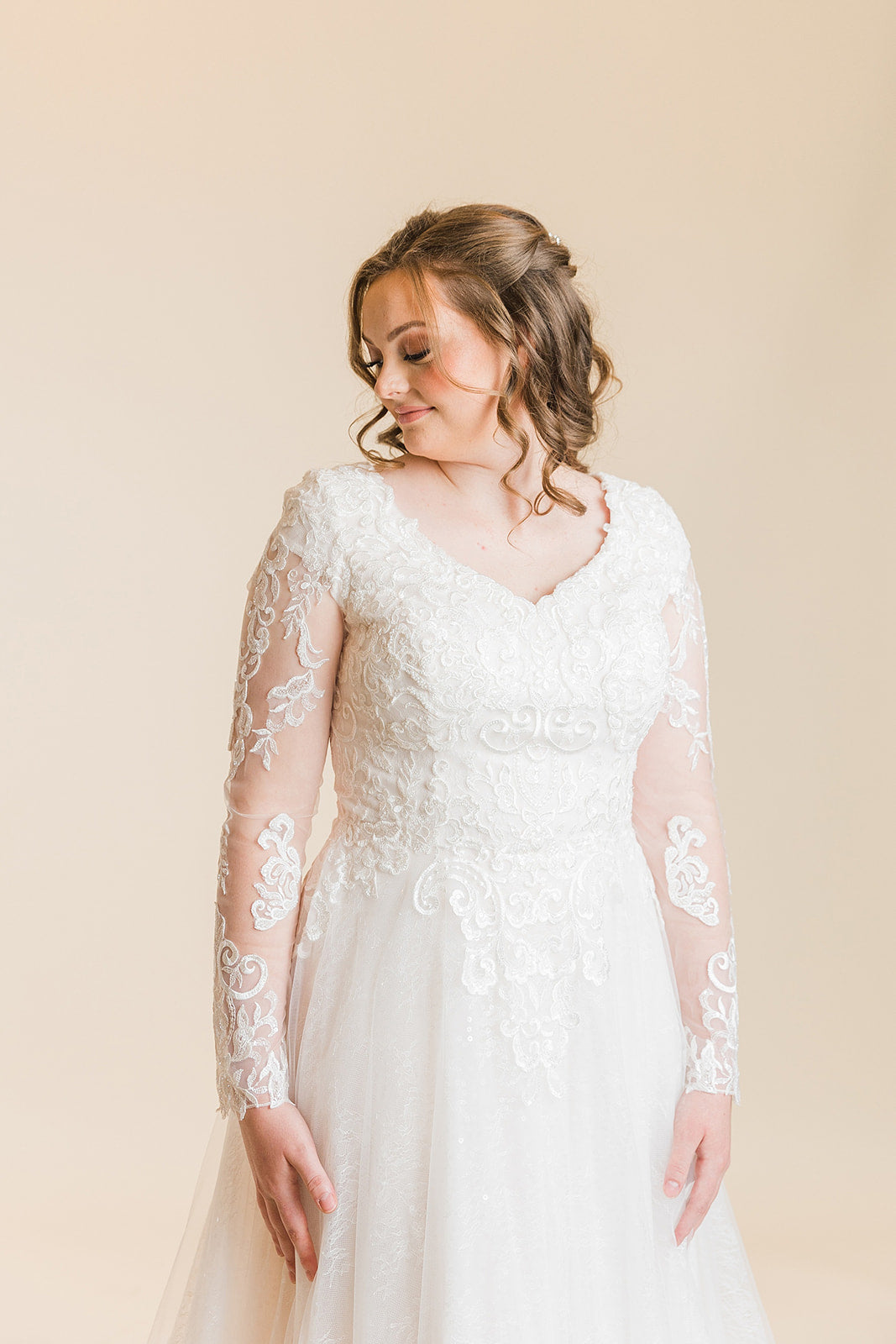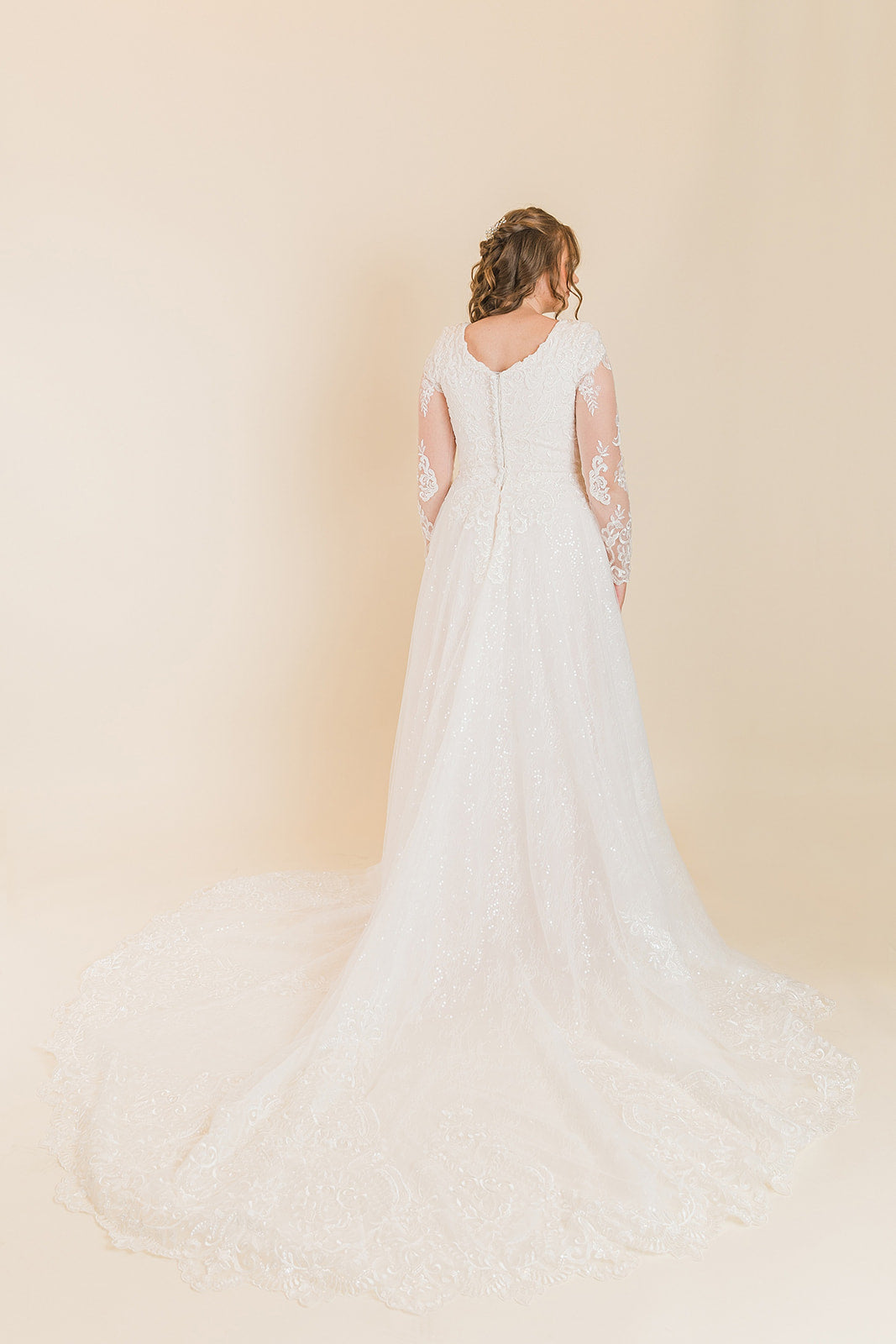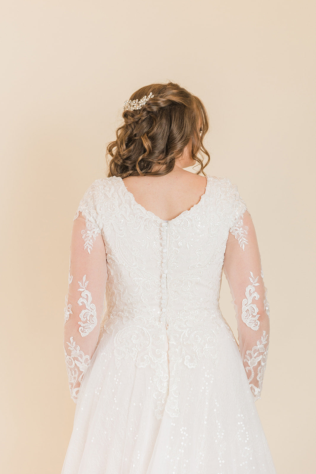 Looking for something flattering, regal, and a dream to wear? Cue this ethereal modest bridal dress featuring soft motifs and delicate illusion in a portrait-ready silhouette. Beautiful full long sleeves and a v neckline on the front and back bodice of this dress, delicate soft lace motifs over a layer of sequined Chantilly lace on this A Line dress. Buttons on the back over the zipper closure and a complimentary matching lace is on the hemline all the way around the bottom edge of this dress. Only available in size 16 in Ivory/Blush.