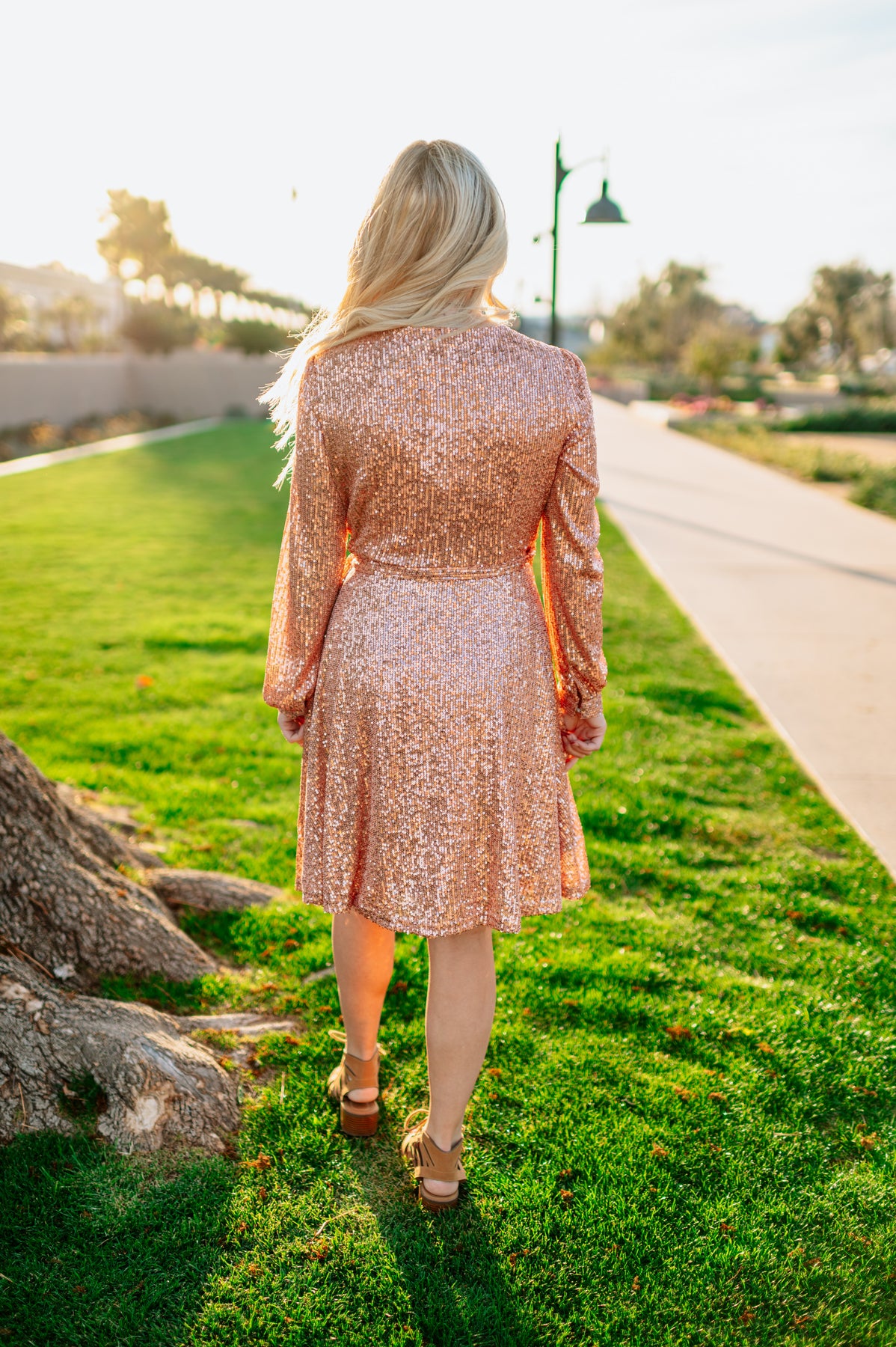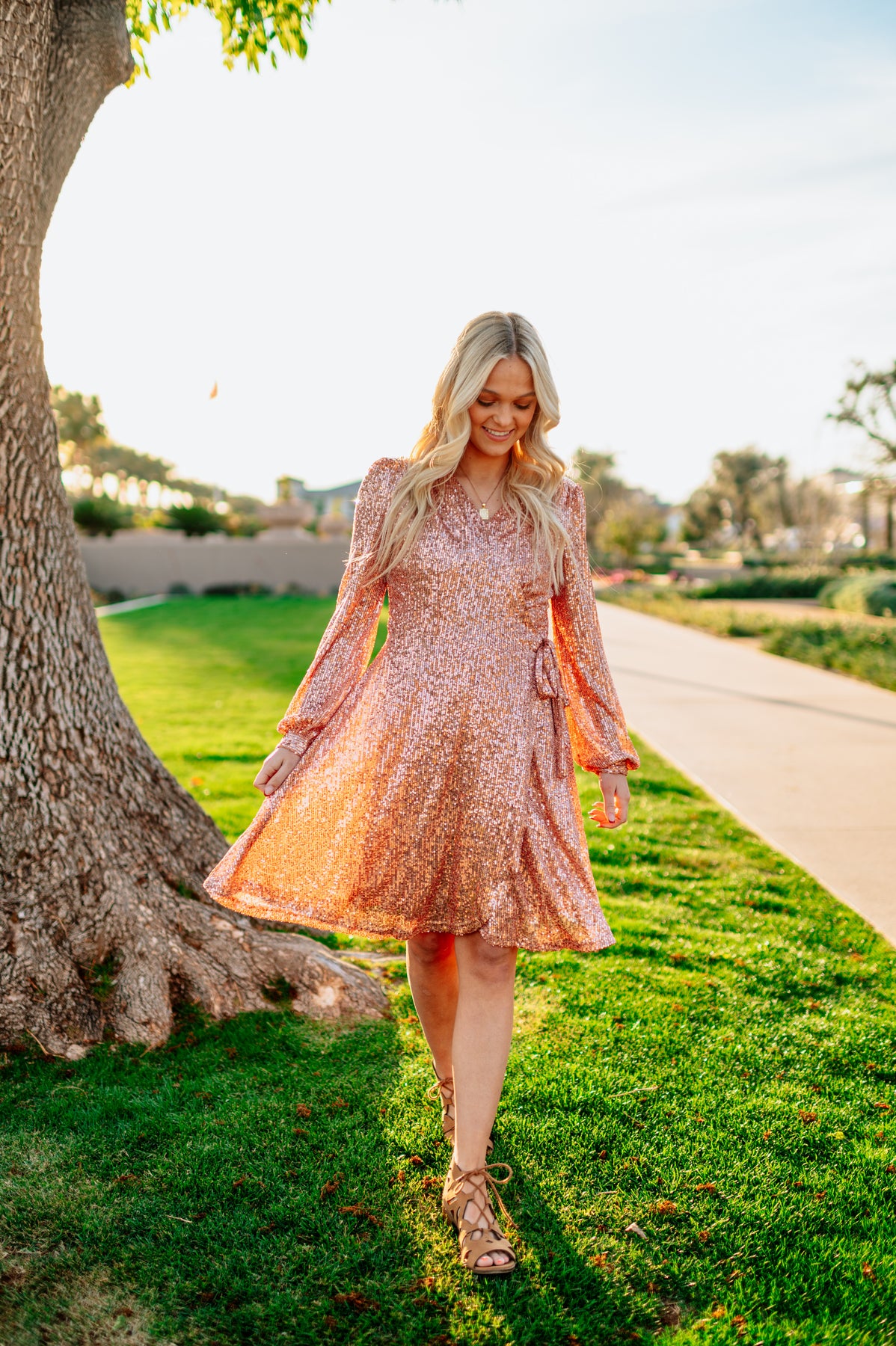 Our Millenia dress is the perfect choice for your upcoming formal or special occasion! It's a long sleeve, knee length, wrap dress that ties at the side and features rows of sequins that make this the perfect choice for any special occasion! Now available in XL, 2XL & 3XL in this color only.