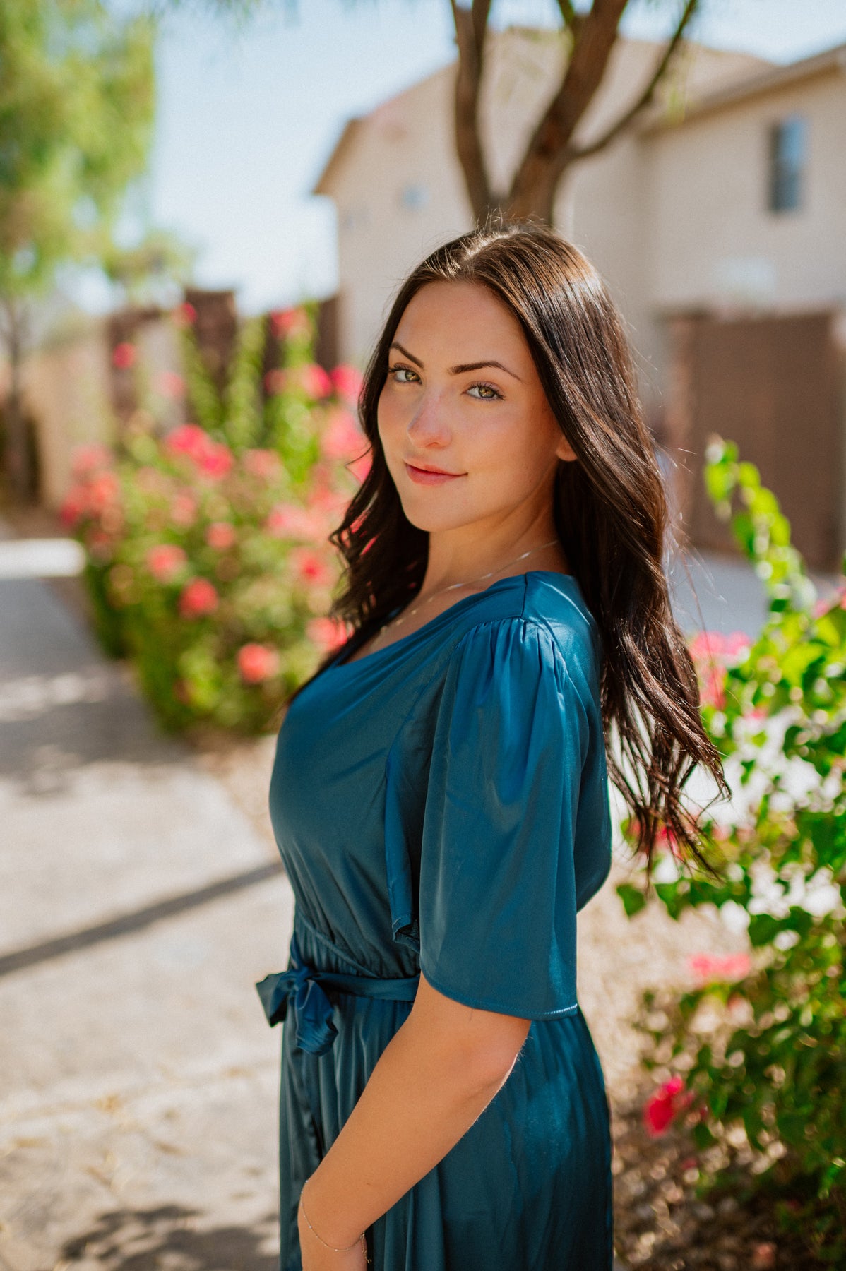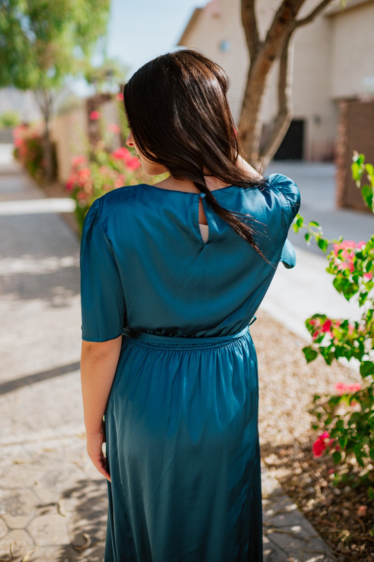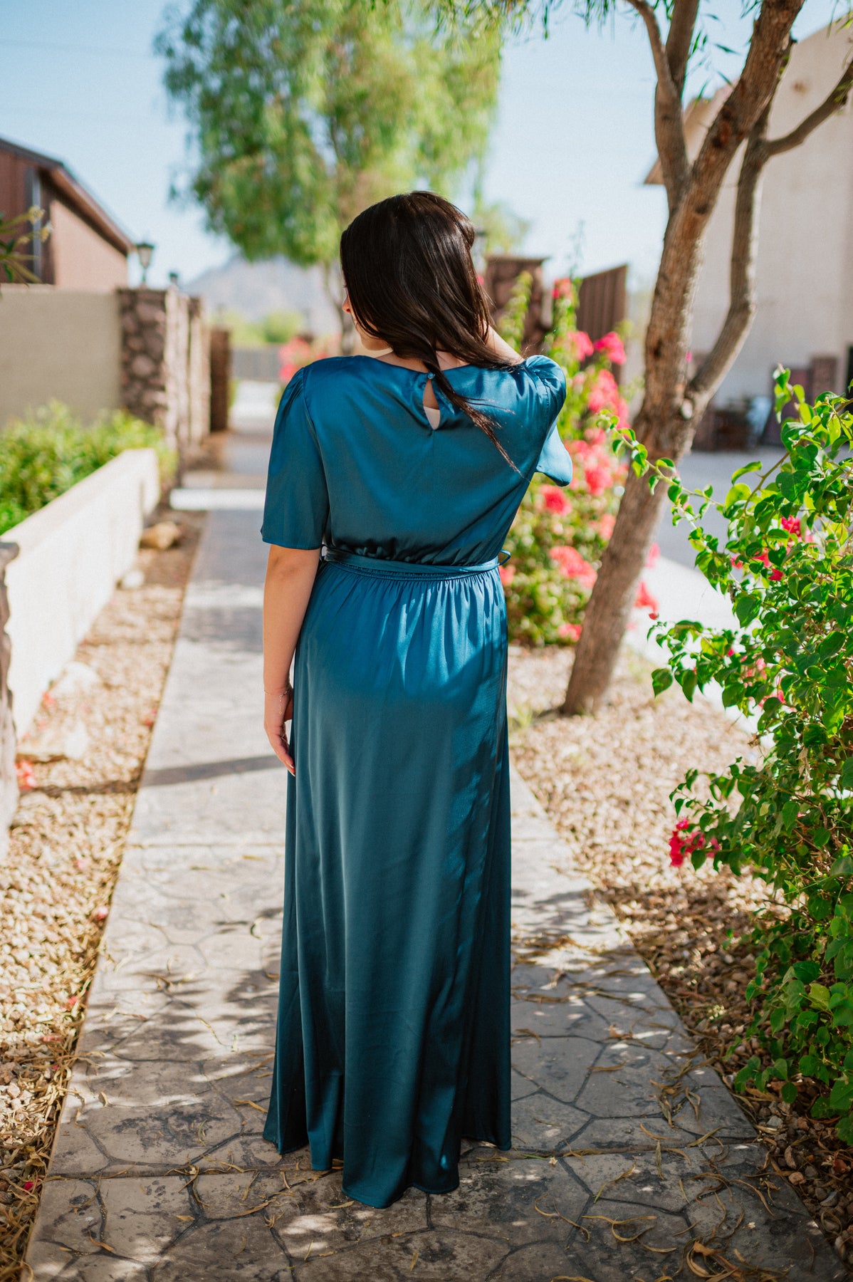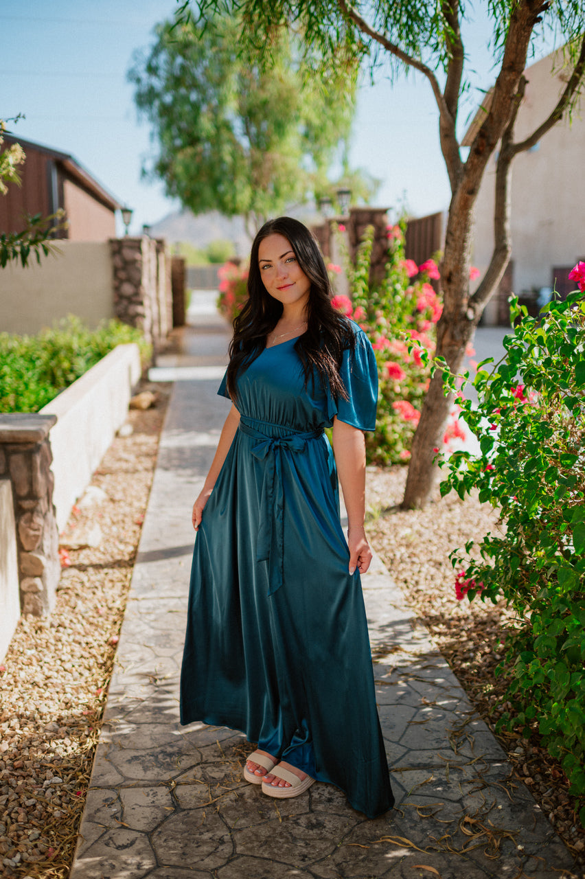 This v neckline dress has flutter sleeves, elastic at the waistband with tie and is a silky maxi length dress that is maternity friendly! We are in love with stunning new Zitta maxi dress! This gorgeous, modest, shiny satin beauty, is a true must have! Can you say 'perfect' bridesmaids dress?! Featuring a v neck bodice, short sleeves, belt tie waistline & flowy maxi skirt and great for a baby bump.