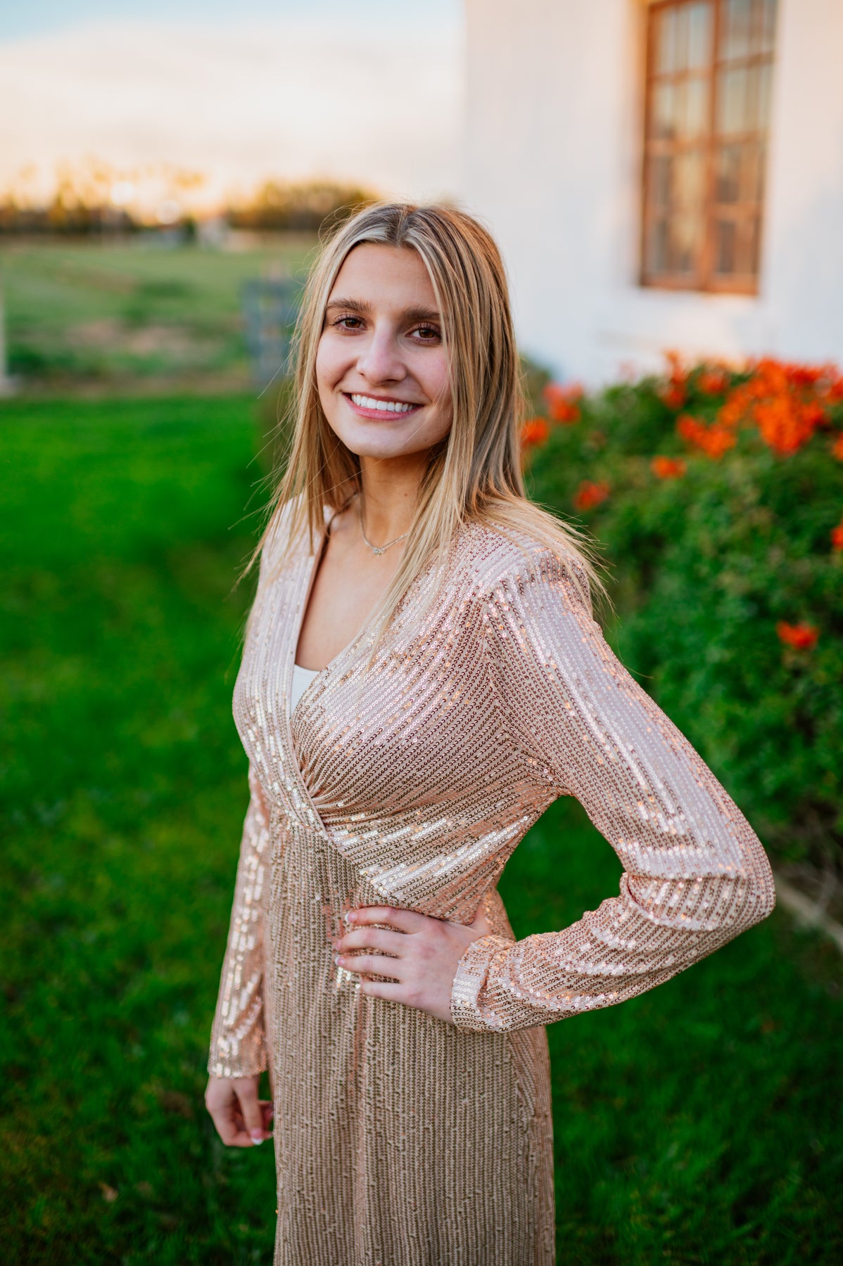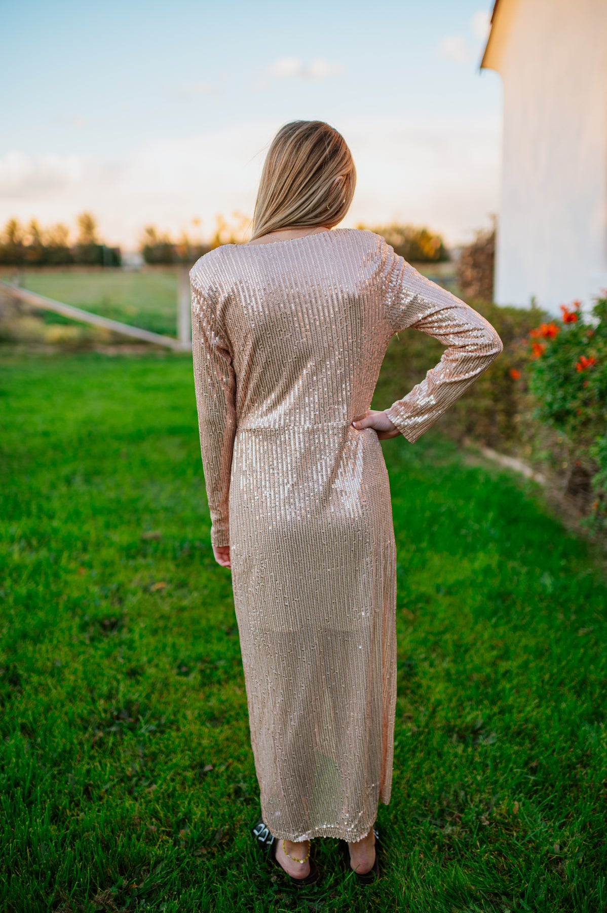 Midi length all sequin dress with V-Neckline and long sleeves and mock style wrap dress. V- Neckline can be raised easily.