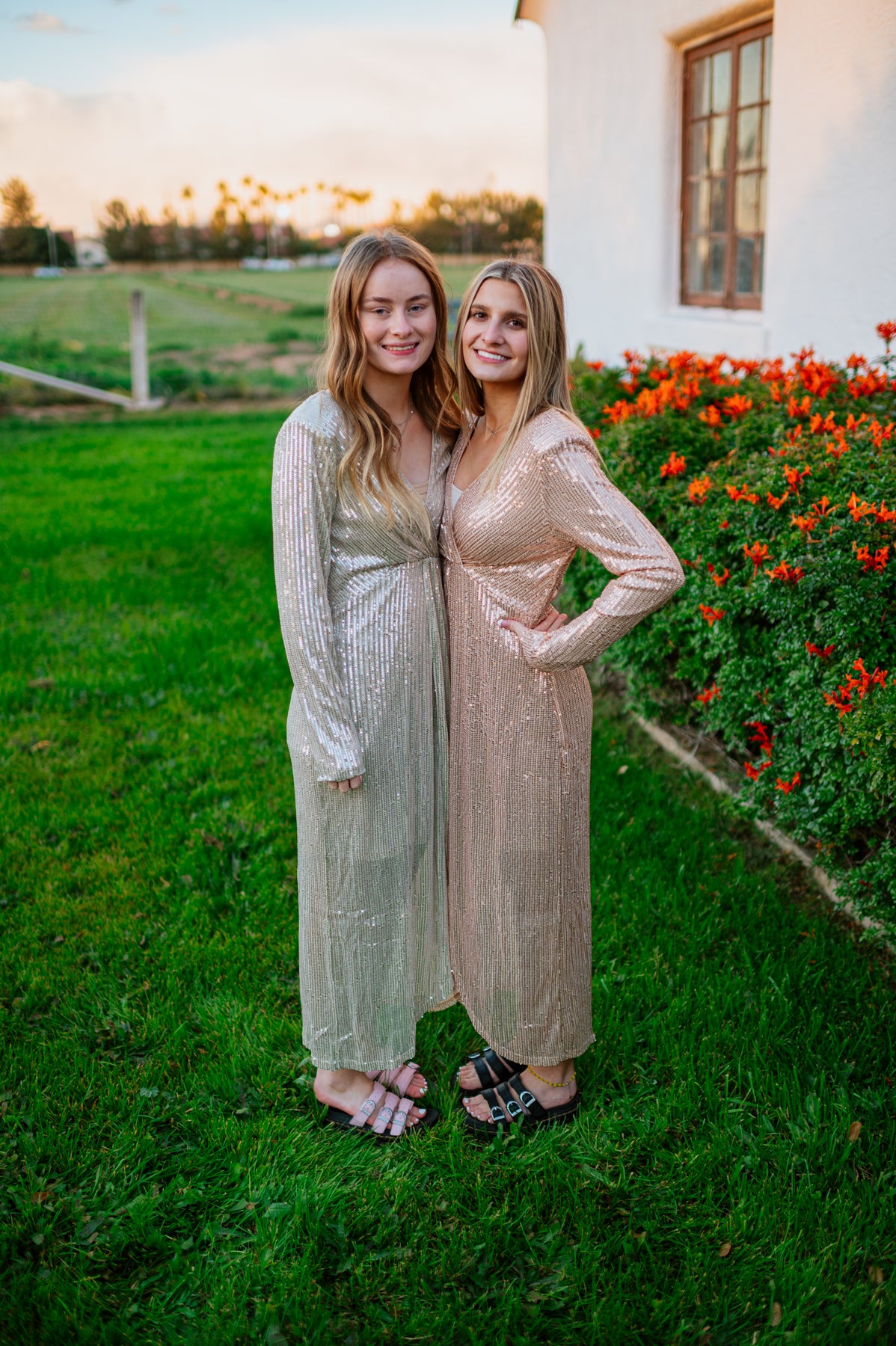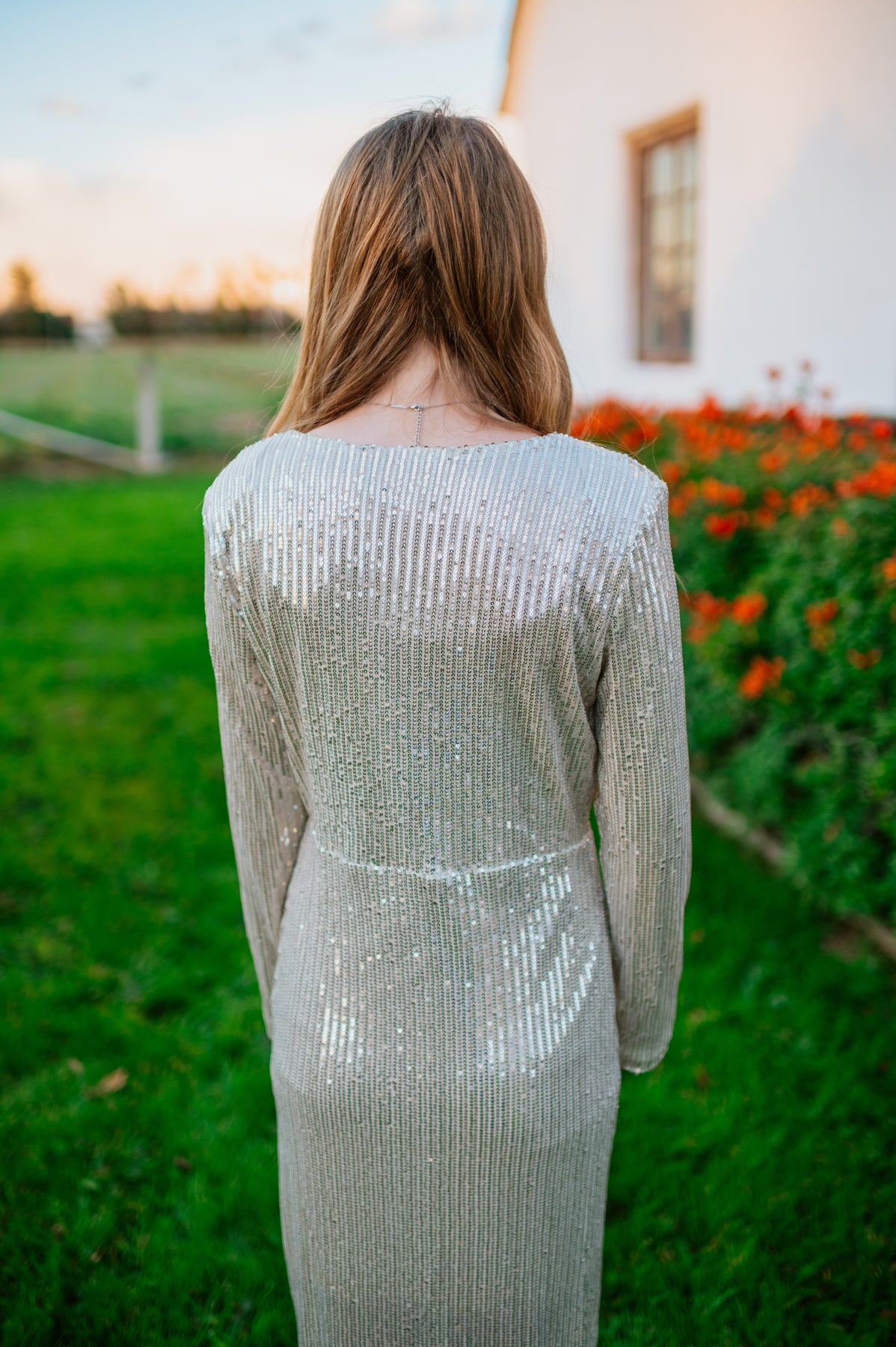 Midi length all sequin dress with V-Neckline and long sleeves and mock style wrap dress. V- Neckline can be raised easily.
