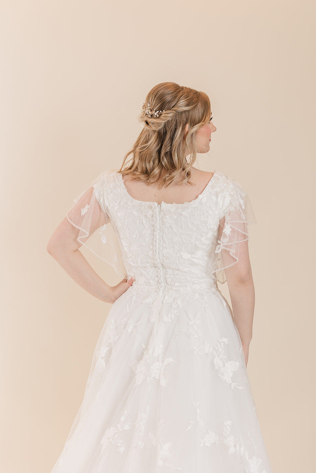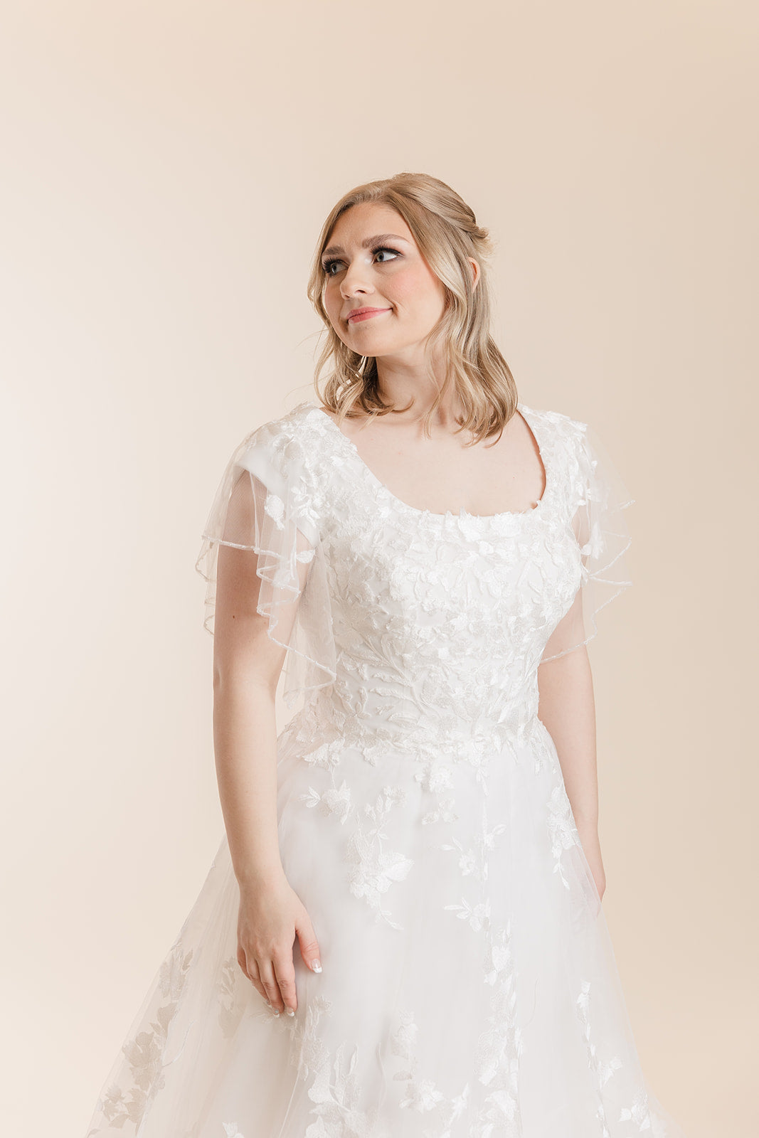 Looking for something flirty and surprising? Layered lace and ballerina-inspired tulle gives this modest bohemian bridal dress a deceptively simple vibe. Scoop neckline on the front and back of this dress and flutter sleeves adds to the beauty of this dress. Buttons over the zipper back closure and stunning train. Only available in size 18 in Ivory/Soft Pearl.
