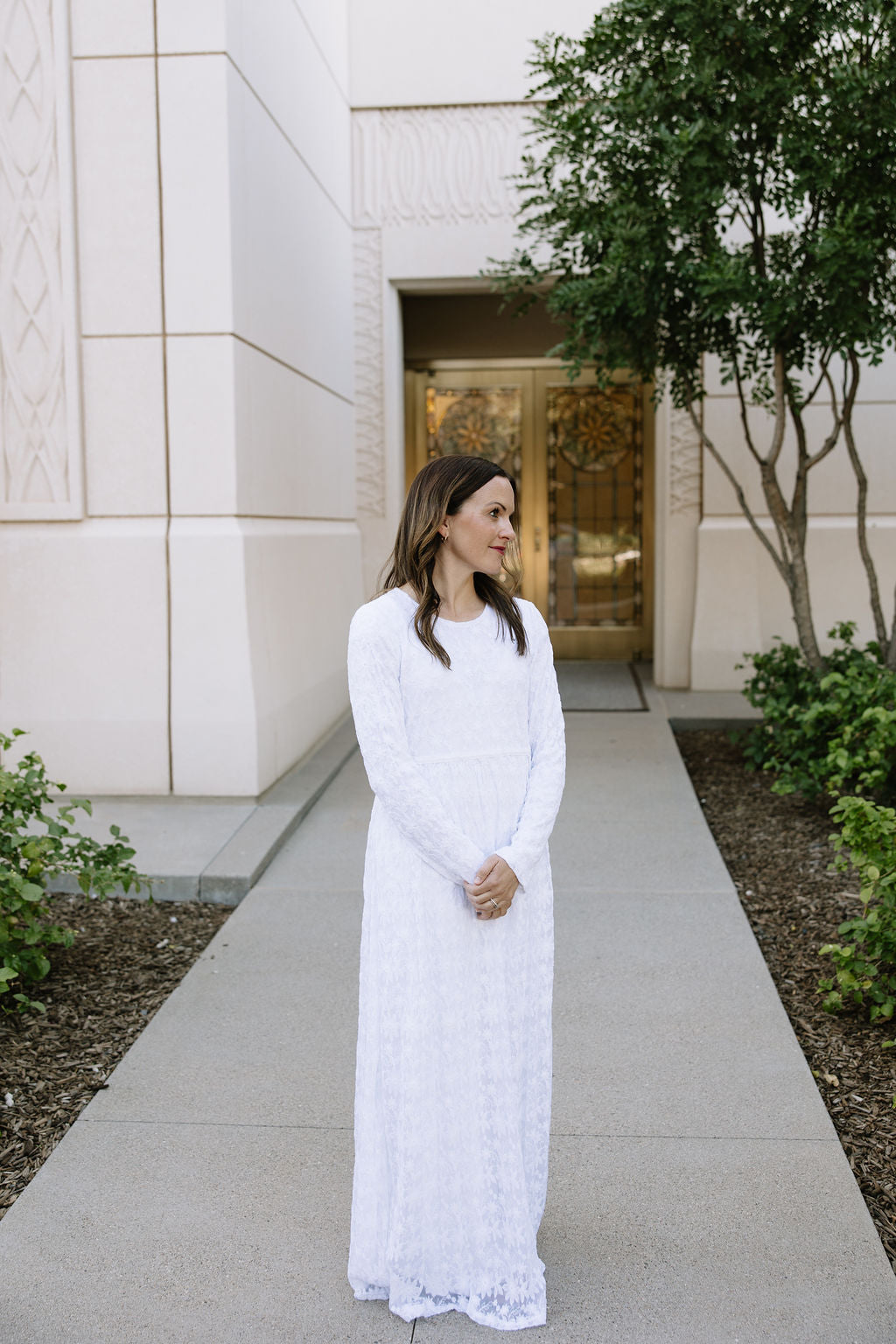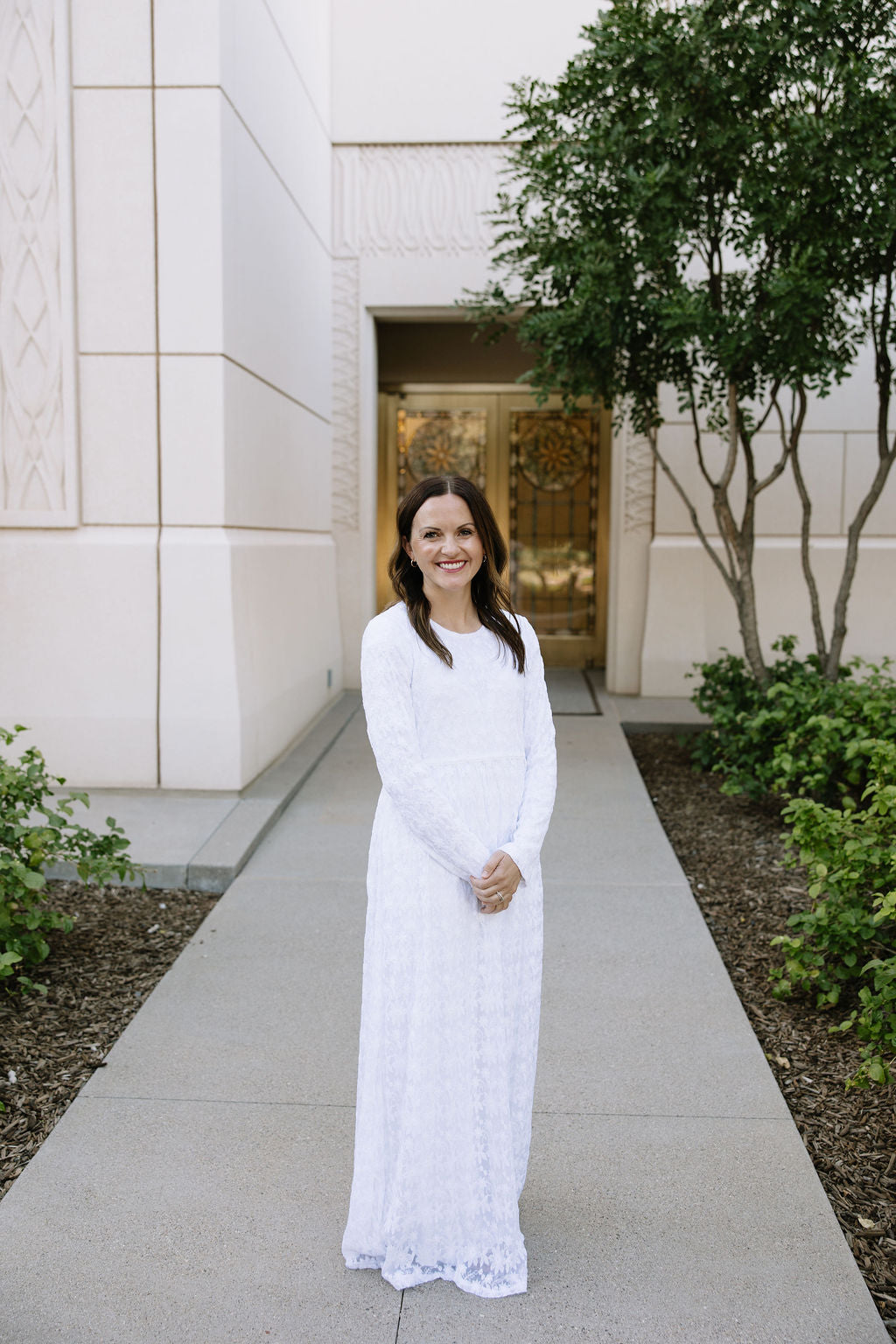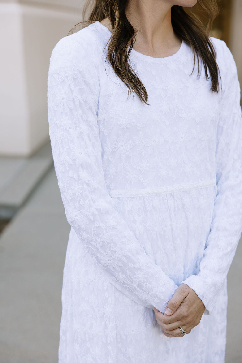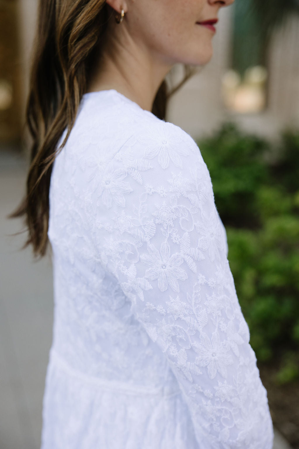 The Calla Lily dress is one of our newest temple dresses with a scoop neckline and lace motiffs on the bodice and skirt of this beautiful dress and a button closure on the back neckline. It is very comfortable and can easily be shortened to fit any height. The comfy dresses has 2 side pockets is maternity friendly and we know you will love our Call Lilly dress! Wash Cold and Line Dry.