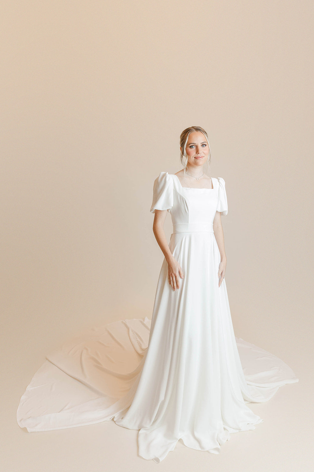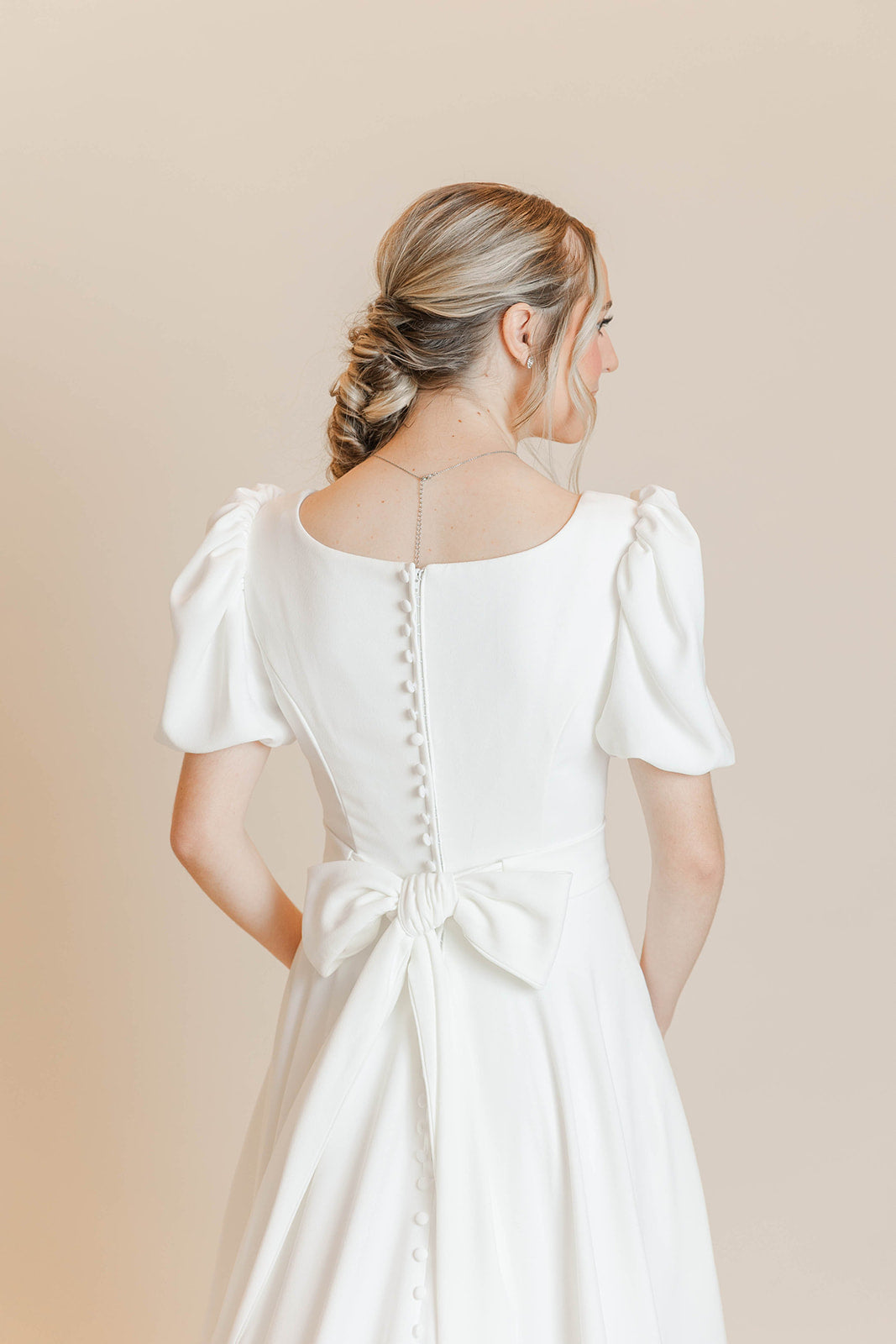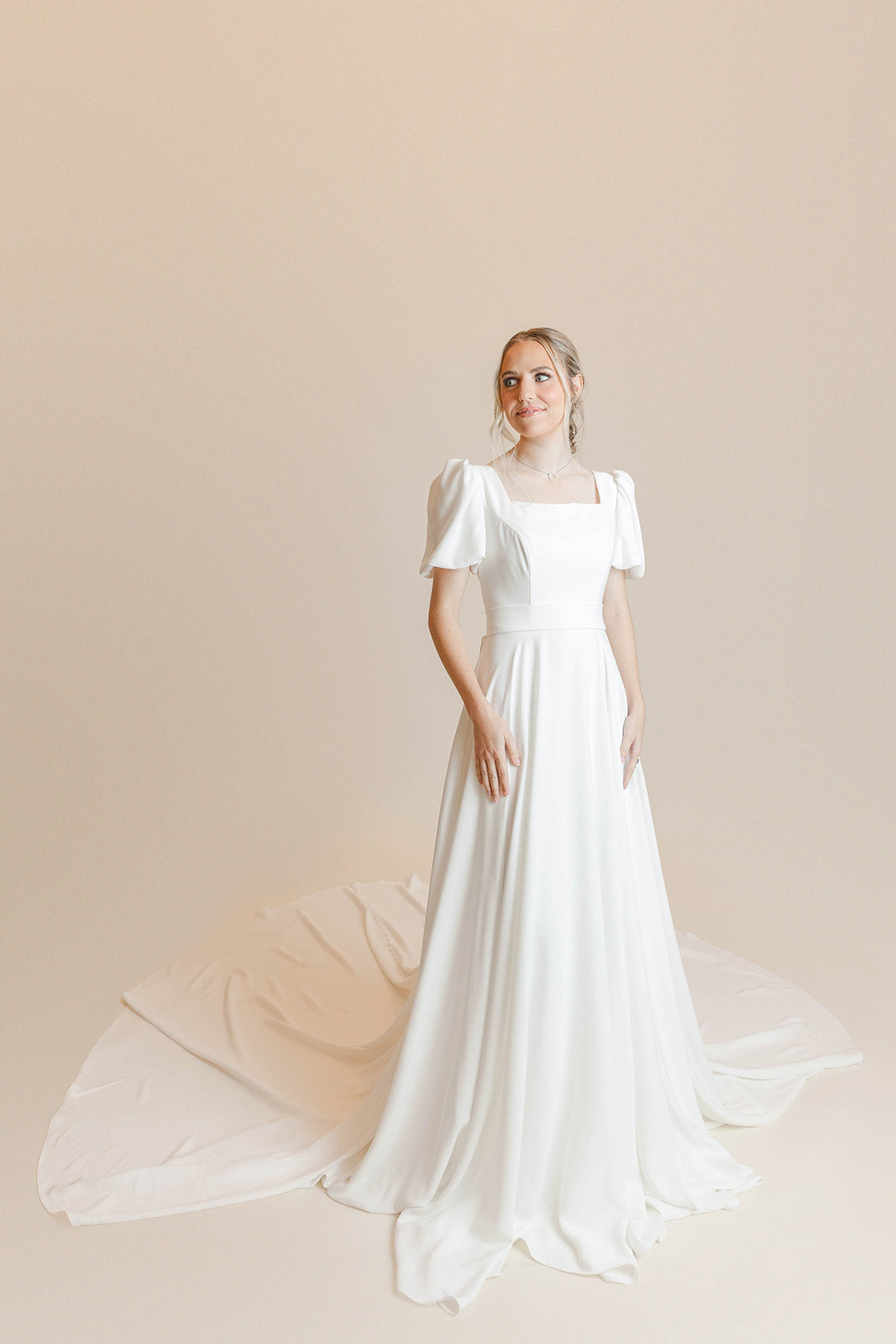 Elegant and modest, this A-line crepe gown features a square neckline with short puff sleeves and a high back finished with buttons down the train. A versatile crepe sash can be tied into a bow at the back or styled in other ways, adding a personalized touch to the refined silhouette.