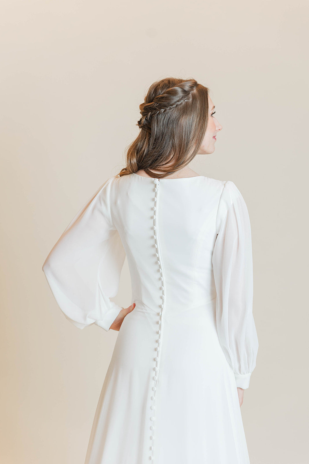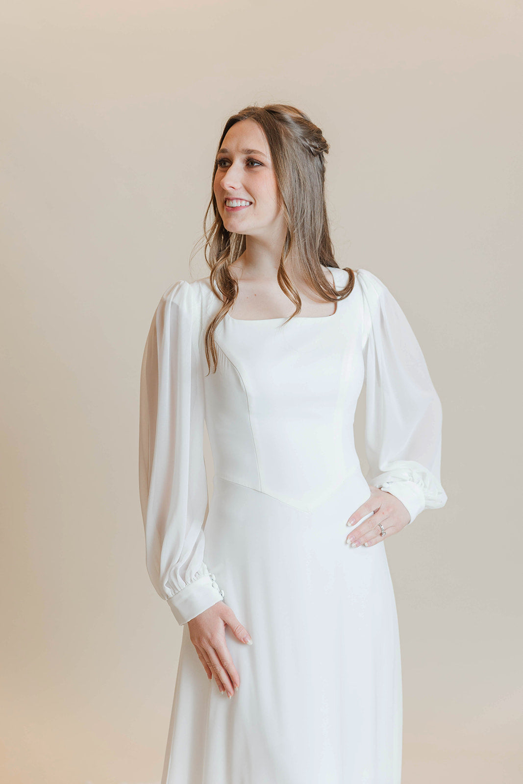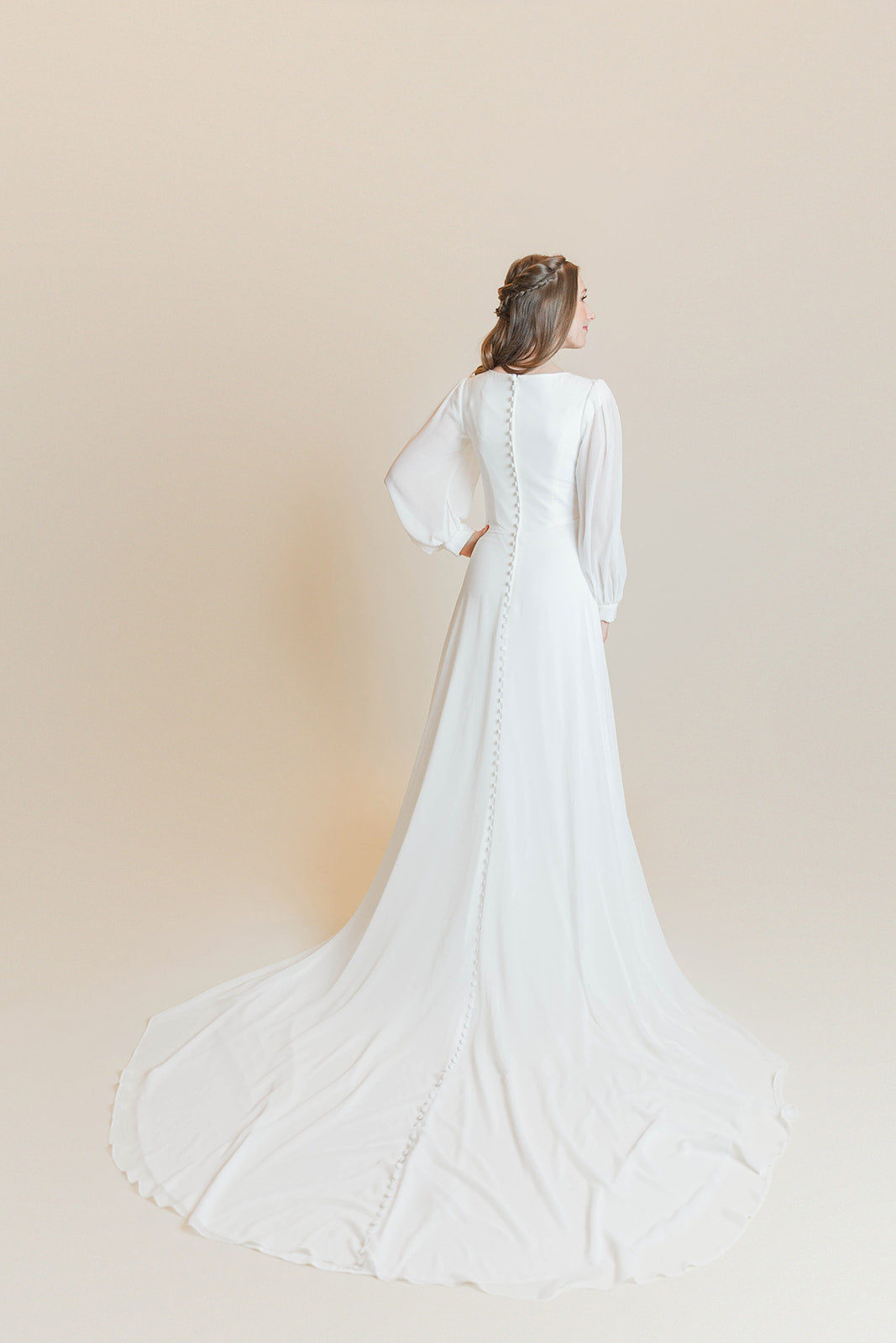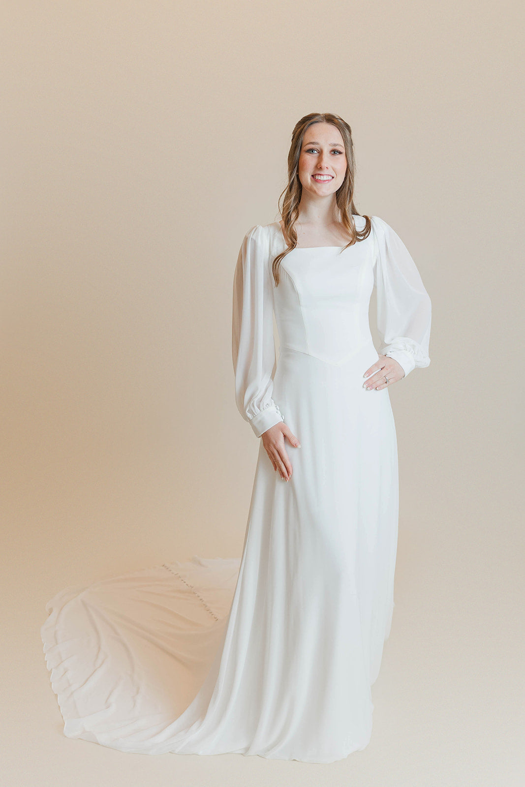 Arlo is a flowing a-line silhouette made of chiffon. She features a modern square neckline, a basque waist, soft bishop sleeves and buttons down the length of the train.