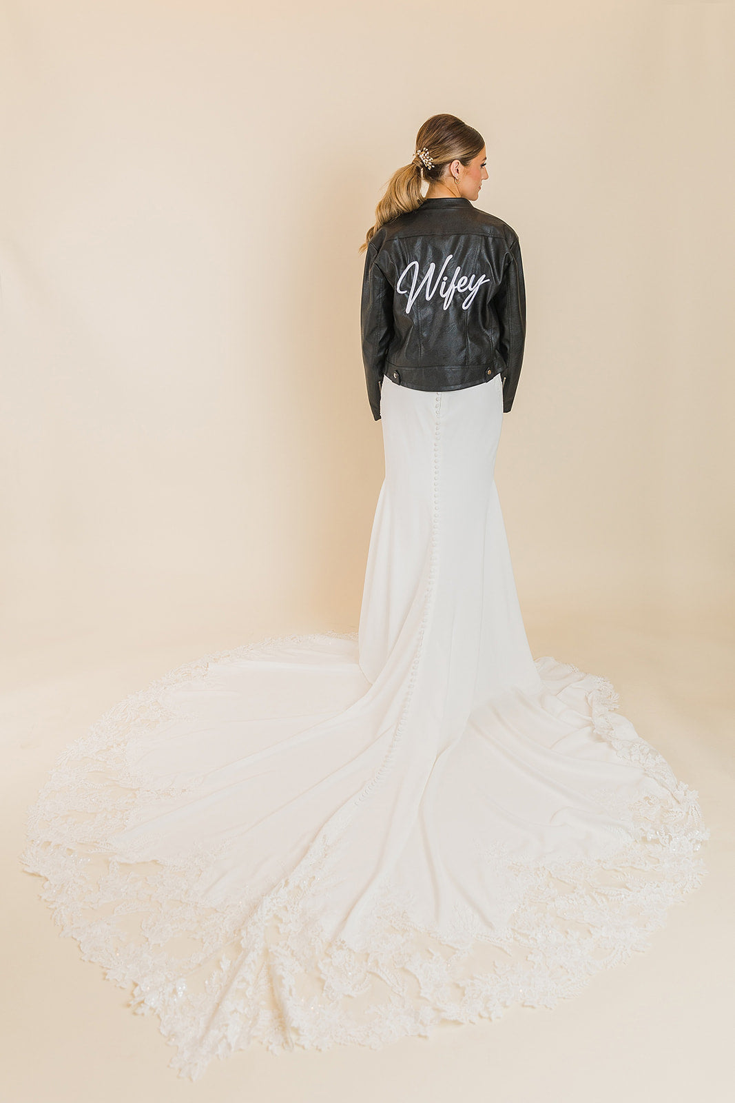 Add a little edge to your wedding day style with our Black Leather Jacket. Perfect for brides who love a mix of elegance and attitude.