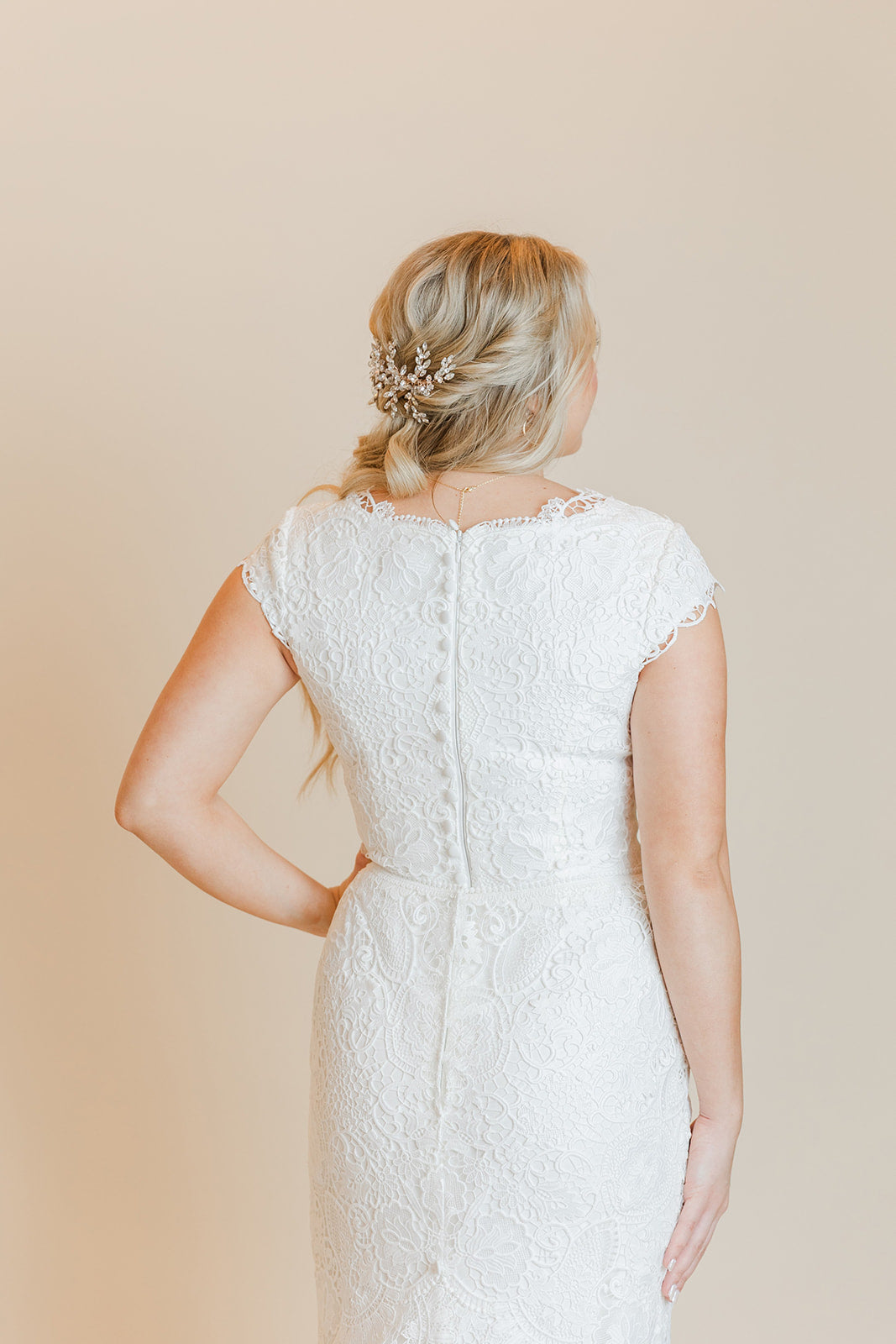 This stunning wedding gown embodies modern elegance and sophistication, perfect for the bride looking to make a lasting impression. The gown features a beautifully structured silhouette that hugs the body in all the right places, accentuating curves while maintaining a sleek and graceful appearance. The bodice is adorned with exquisite lace detailing, adding a romantic touch and intricate texture that enhances the overall design. The classic round neckline and short cap sleeves of this gown strikes a perfect balance between modesty and femininity. The lace overskirt skirt which is detachable, is placed over the crepe skirt giving a whole new look. This 2 piece wedding dress set is perfect for a bride who wants 2 looks but only one dress.