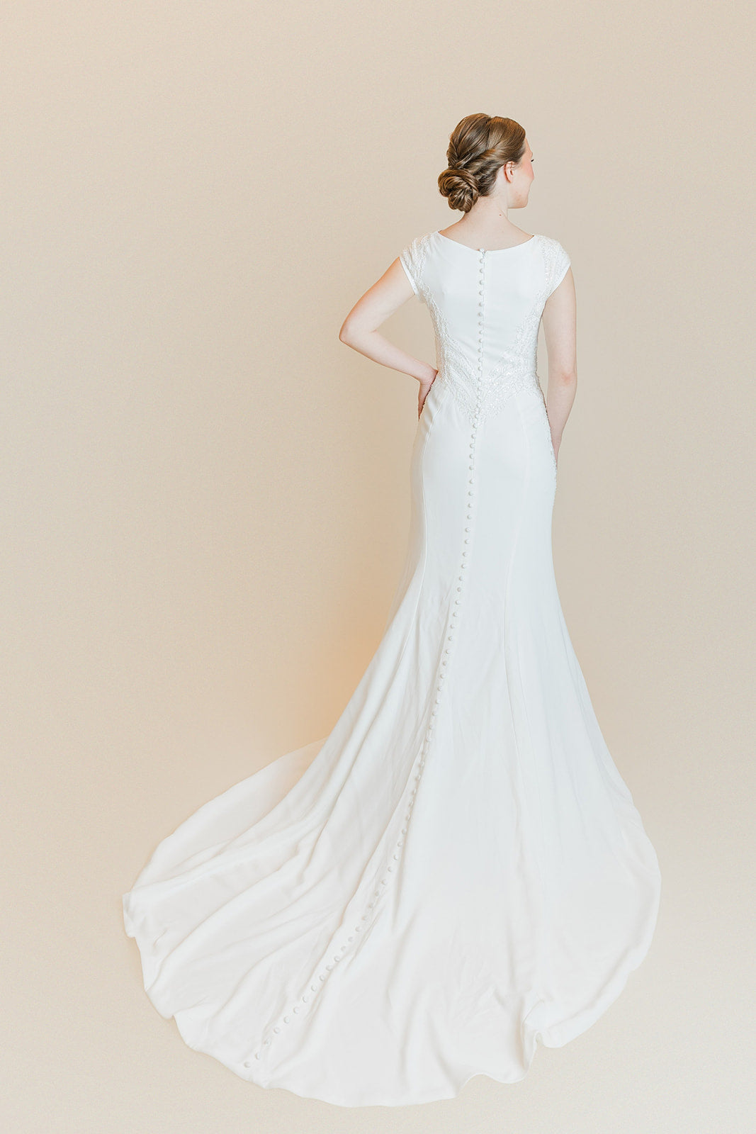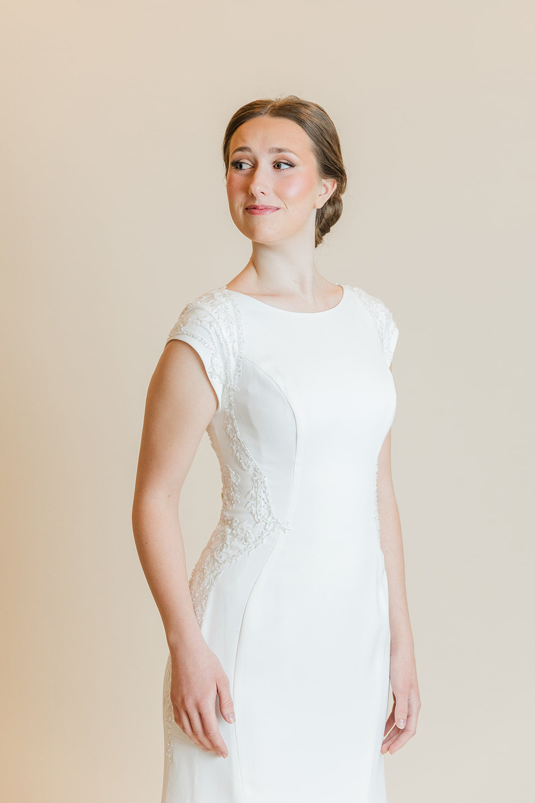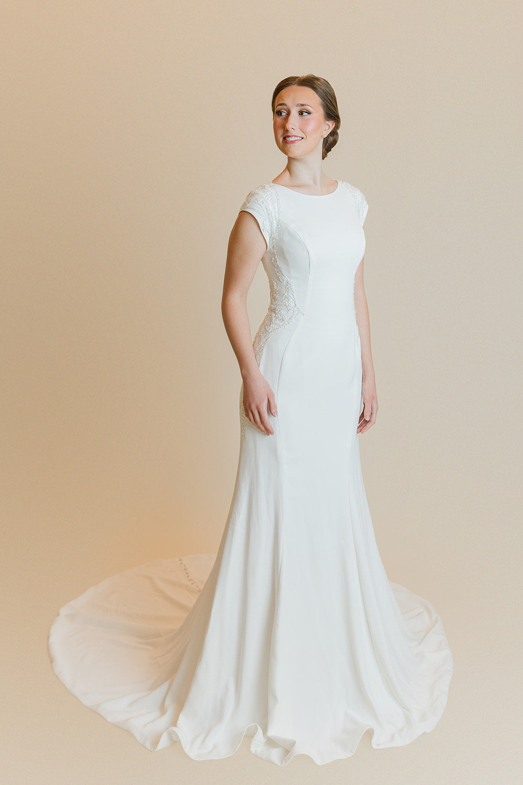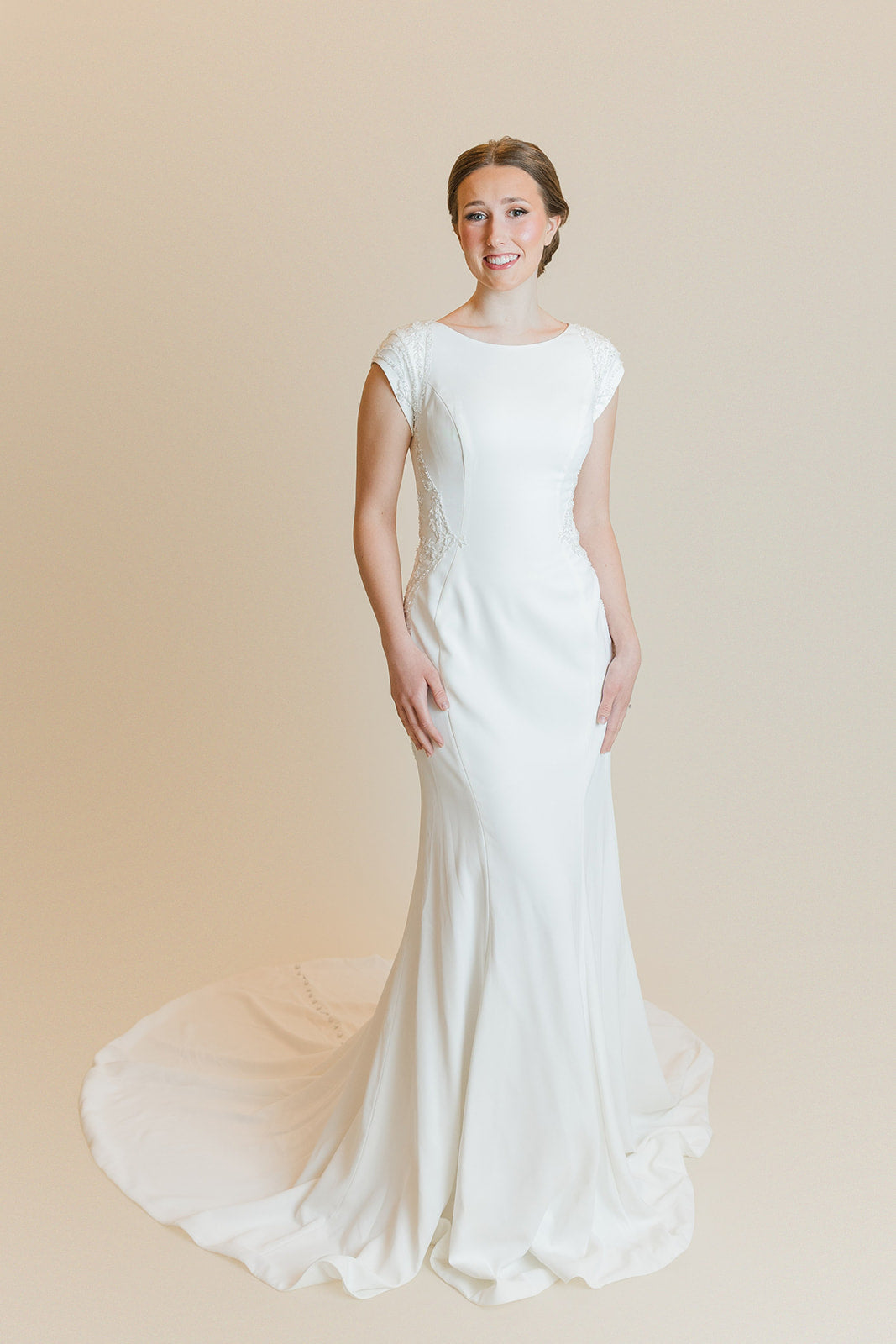 The Raelynn dress has a classic fit and flare silhouette with a high rounded neckline and short sleeves. The gorgeous beaded detailing along the sleeves, sides and back give this wedding gown a slimming effect and adds a sophisticated twist to the simple lines of the dress. The chapel length train adds the bridal touch to the beautiful gown.